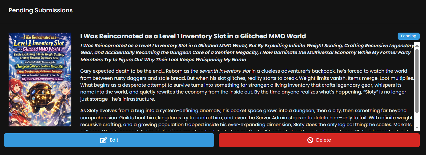 >>25172980It's up.https://www.royalroad.com/fiction/159652/i-was-reincarnated-as-a-level-1-inventory-slot