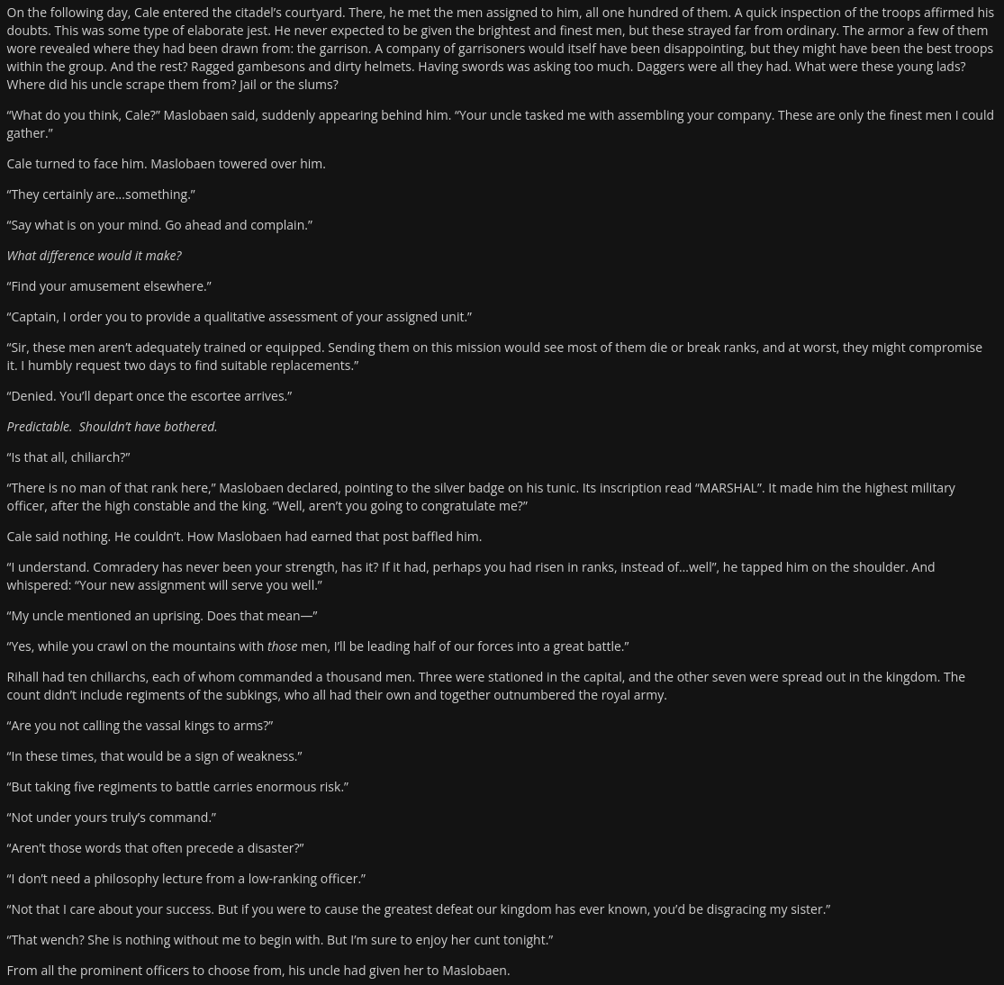 It saddens me to witness what has become of our once-mighty sect. So many promising juniors have been led astray by the e-celebs and their heretical Dao of Show, Don’t Tell, along with the rigid mantra of trimming ten words from every passage. Such misguided teachings have stunted the growth of countless young practitioners.Even now, they bicker over hollow abstractions like genre labels and the ever-shifting standards of Royal Road, while our numbers dwindle with each passing day.A pity.If the Slop Master were here, he would have set these wayward juniors straight. Alas, he has departed on a long journey, and I know not when, or if, he will ever return.Is there any martial hero out there who could save us? Or is our sect fated to wither and fade away beneath the cruel passage of time?
