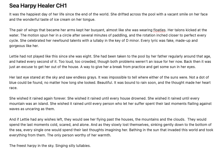 >>25177715what setting is this? the conventional descriptions (ice cream, floaties, D minor, house and houses, community pool) seem to suggest it's somewhere close to earth, with present-day technologyto me it's sitting in an ambiguous spot of harpies and hydrophilic creatures and multiple suns, with an awkward number of descripions that try to ground it in a contemporary setting (the pool is crowded? what kind of pool? what kind of crowd? a human crowd or other sea harpies? other monsters?)