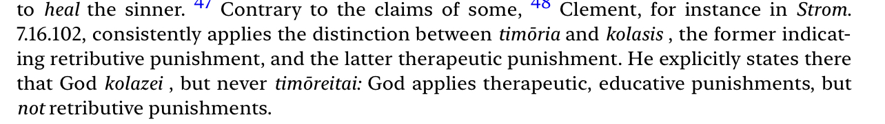 >>25180501>>25180536And a further comment on Matthew 25:46, not only does aionios not mean eternity, but instead 'age', the Greek word for 'punishment', kolasis, mentioned in that verse is not retributive punishment, but restorative punishment, like your teacher giving you a one hour detention afterschool for misbehaving in class. That's why in the translation I mentioned here >>25180525, it's translated as chastening rather than 'punishment', as the latter English word lacks the inherent restorative connotation of kolasis.