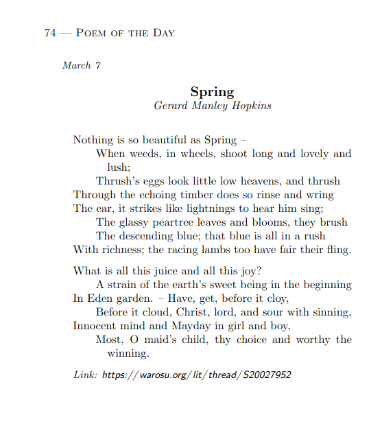>>25192022If it becomes a bit dry, just start reading some famous simple poetry at first. Not Milton and T.S. Eliot. We even had these "poem of the day" threads for a year or whatever in 2022, it's available on libgen still. Just search for "lit poem of the day." You can read them and the warosu discussion thread alongside each one.Admittedly, most of the discussion threads are not very insightful, but it's better than nothing.