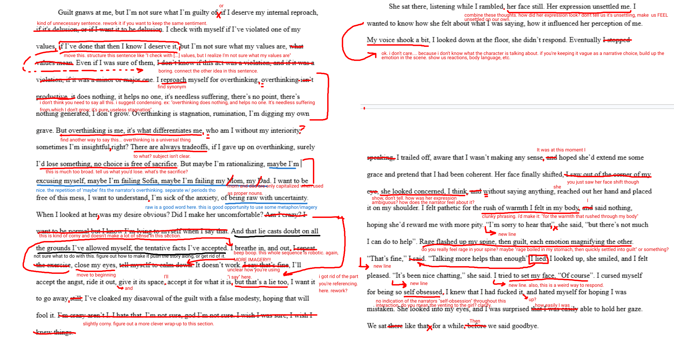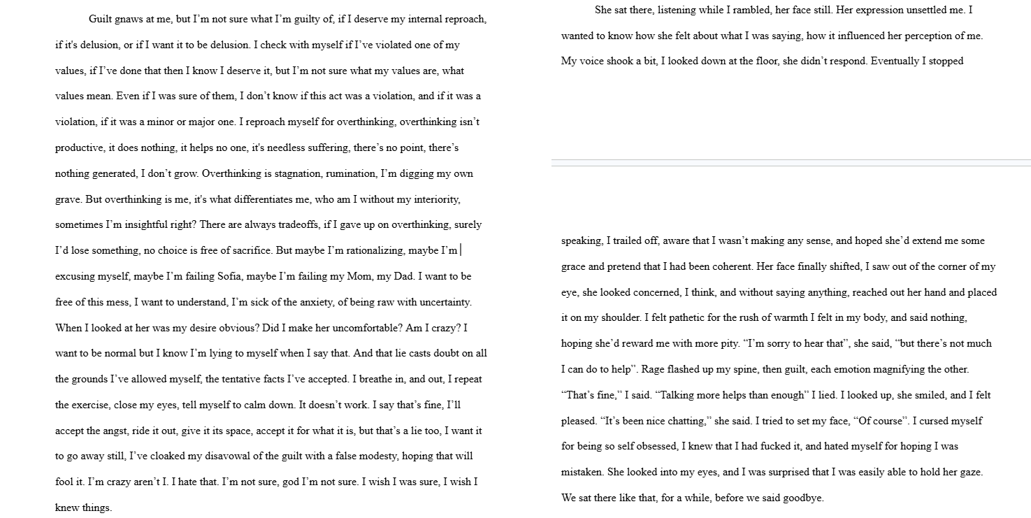 I'm a native English speaker and write on vibes so I have no idea what grammar rules if any were broken. Either way I'm trying to capture an anxious stream of consciousness where thoughts often bleed into incoherence/grammatical incorrectness.