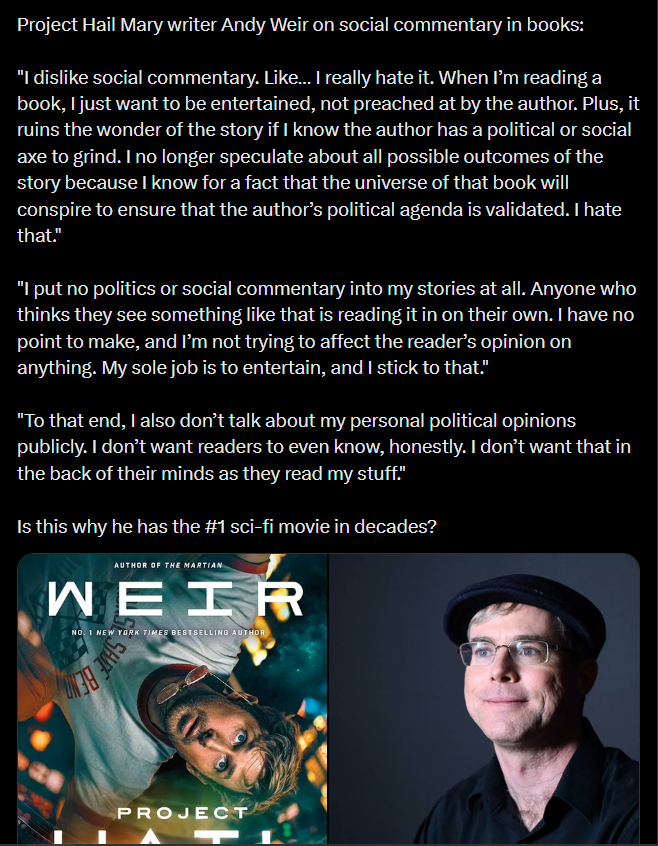 >>25198162Andy's personal politics are in the story. They're just sufficiently boring to not be remarkable. The world banding together to solve the problem isn't idealistic as fuck? Somehow a global task force is created with enough resources to build spaceships, to operate on aircraft carriers? Even the interspecies cooperation plot is heady idealistic space communism. >>25198825>doesn't want to inject anything into his work other than the story and exclusively wants to entertain and not educateHis work is injected with a fucking laundry list of his personal likes and dislikes from art to science and yes, politics as well. What he's presumably trying to say is that he doesn't want his story to just become preaching to the reader. But even that is half baked because there are plenty of good books that openly proselytize the reader. So the actual problem is bad writing. This whole "THEY MADE IT POLITICAL" debate is uncharitably just a bunch of chuds being asspained by experiencing any media that disagrees with them. Charitably, it's more about the delivery being awful and they're just too dumb to articulate this. The back and forth on deliberately political media like Star Trek exposes them as drooling retards even when given hours to articulate their objections so the problem is likely the former, not the latter. Andy's comments were in direct response to this crowd as he said it on some youtube retard's podcast.