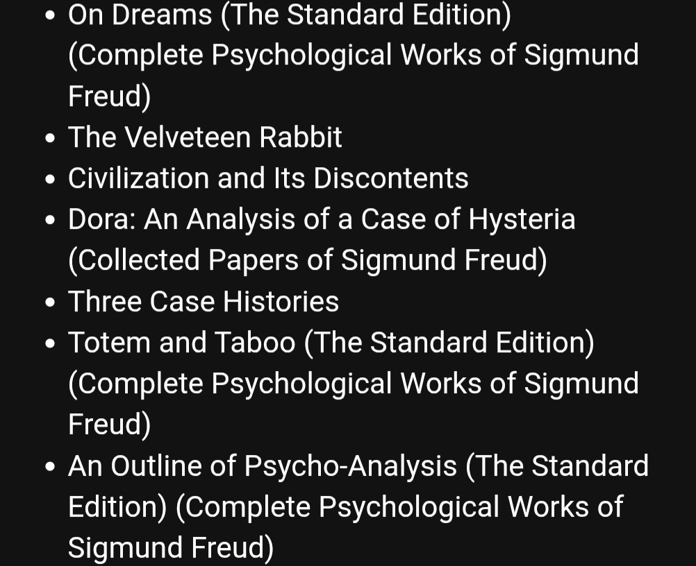 >>25201332Thanks, this was what I wanted to know. I just found an online store with a bunch of Freud going for $1-2 a piece and made an order (picrel). I've read a bit of Jung and his dream interpretation stuff can be a little questionable too so I'm not too worried about being put off by any of that