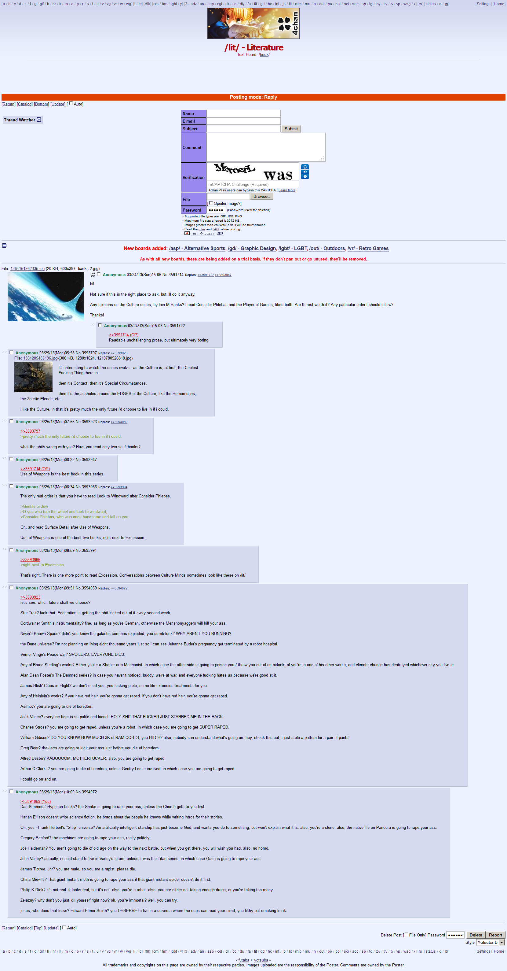 What does /lit/ think of Iain M Banks and his work? He has literary, non-genre novels and science fiction novels, as well as thrillers. I’m getting back into the Culture series because my dad always forced me to read Wasp Factory as a kid. What an immensely talented wordsmith with breadth and depth. I feel like Wasp Factory in particular is right up this board’s alley. The twist is amazing and it lives in this antisocial world that only Frank and 4chan NEET alike seem to inhabit.