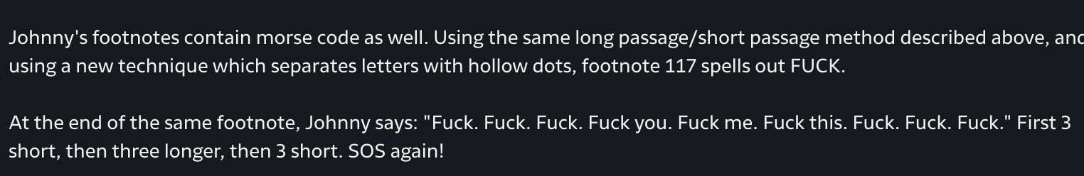I respect the Johnny Truant segments without enjoying them.>DUDE it's a book that's bigger on the inside, it's two books inside of one book LMAOI respect that without enjoying it.>DUDE the real horror is the horror that happens in real life, the supernatural can have a happy ending but not the natural LMAOI respect that without enjoying it.
