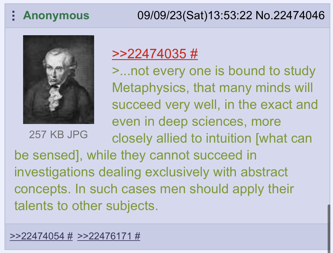 >all this STEMfag retardation ittGrim. To the OP first you have to understand why Kant makes this analytic/synthetic distinction - because synthetic propositions are going beyond one concept and joining it to another, separate concept. It was important for him to make this distinction and to point out that even math is ‘synthetic’ in this way because this is the kind of thinking he thinks needs a second-order, transcendental justification. So far so good, math is synthetic. The issue is that ALL concepts, and so all judgments, are also synthetic. Even the classic ‘unmarried men are bachelors’ rests on a synthetic concept, ‘bachelors’. So Kant is perhaps right that these concepts and judgments need to be explained, but his dichotomy is not rational, even if it is illustrative. That’s Fichte’s take and he is right. Meanwhile analytic/synthetic has another meaning as well in philosophical writing - analytic propositions do not go beyond the subject, while synthetics do. In this sense, math is analytic because it proceeds by equality. That’s Hegel’s take and he is also right.