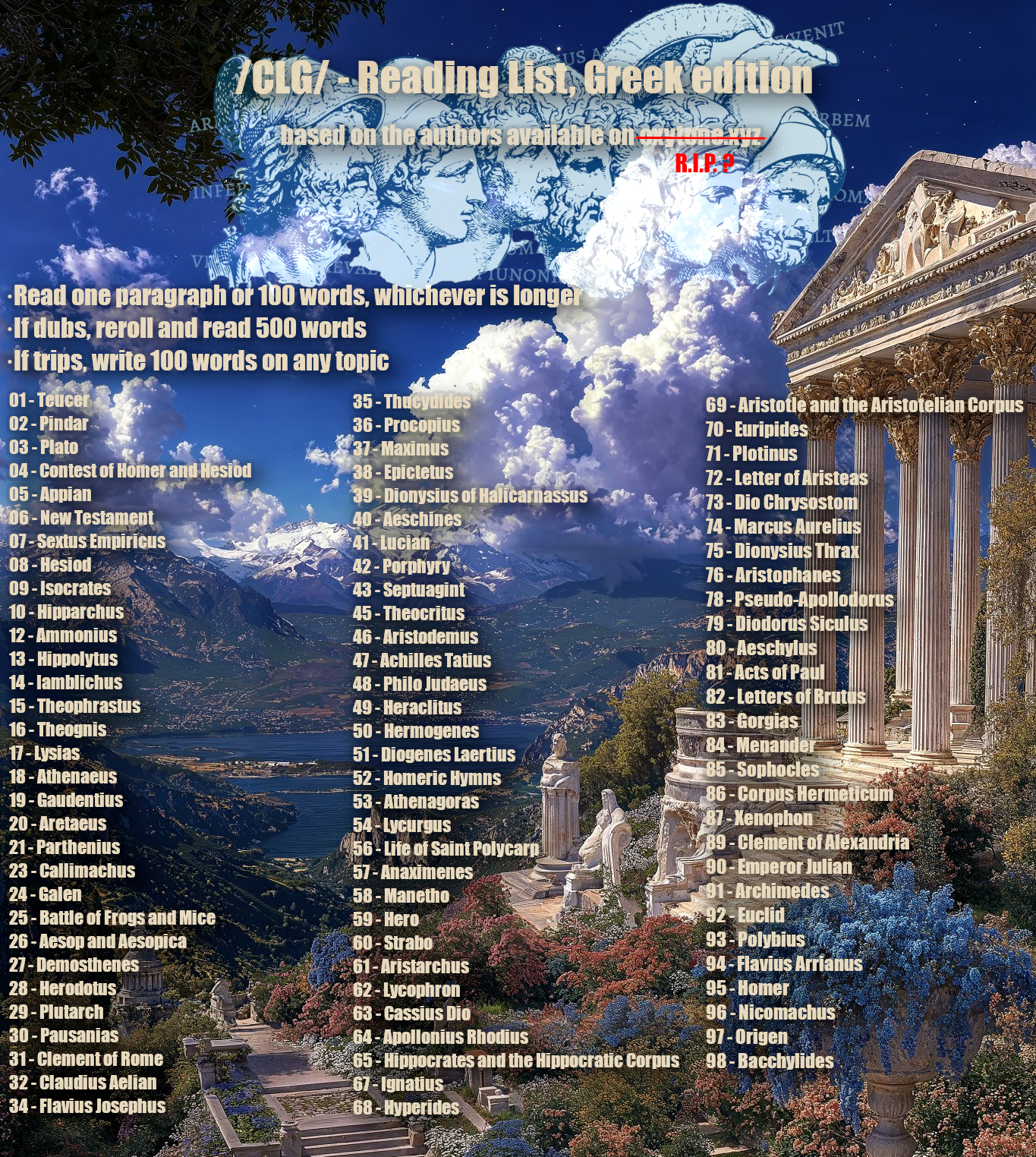 Ἔαρος νέον ἱσταμένοιο edition>τὸ πρότερον νῆμα·>>25151591>Μέγα τὸ Ἑλληνιστί/Ῥωμαϊστί·https://mega dot nz/folder/FHdXFZ4A#mWgaKv4SeG-2Rx7iMZ6EKw>Mέγα τὸ ANE·https://mega dot nz/folder/YfsmFRxA#pz58Q6aTDkwn9Ot6G68NRg>Work in progress FAQhttps://rentry dot co/n8nrkoAll Classical languages are welcome.