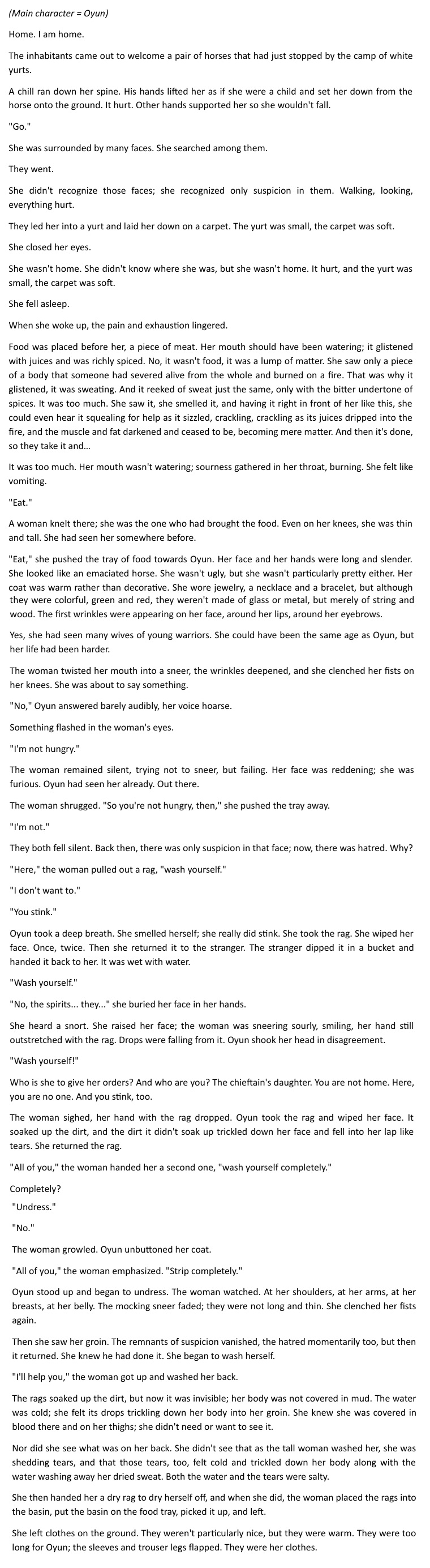 >>25210098Yea, it's from the middle.Oyun is young woman who just experienced bride kidnapping and rape, in the excerpt she arrives with her rapist to his camp to be his concubine. In the country and time the story is set rape is crime, bride kidnapping isn't, as was the case at the time.