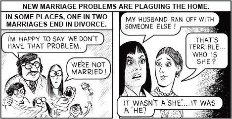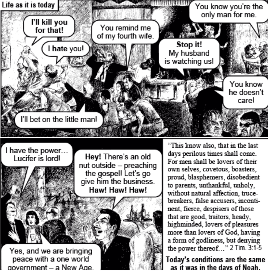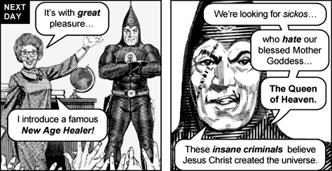 >>25213088Chick tracts. They were little comic books created by Jack Chick and marketed to church groups to be given away as evangelism material, you can find pretty much all of them online if you search around.. Many were pretty orthodox protestant Christianity but Chick also had some bizarre takes and as a result some of them got pretty crazy. >>25212637 is from The Last Generation and >>25213055 is from Dark Dungeons, both particularly deranged examples.
