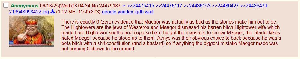 >>25217292he won so much he got tired of winning>hate Aerys because he took your crush's virginity>overthrow the Targaryen dynasty and kill his son and grandkids>put your daughter on the throne>she immediately begins acting like a Targaryen>refuse to accept that she might not be yours>die on the shitter