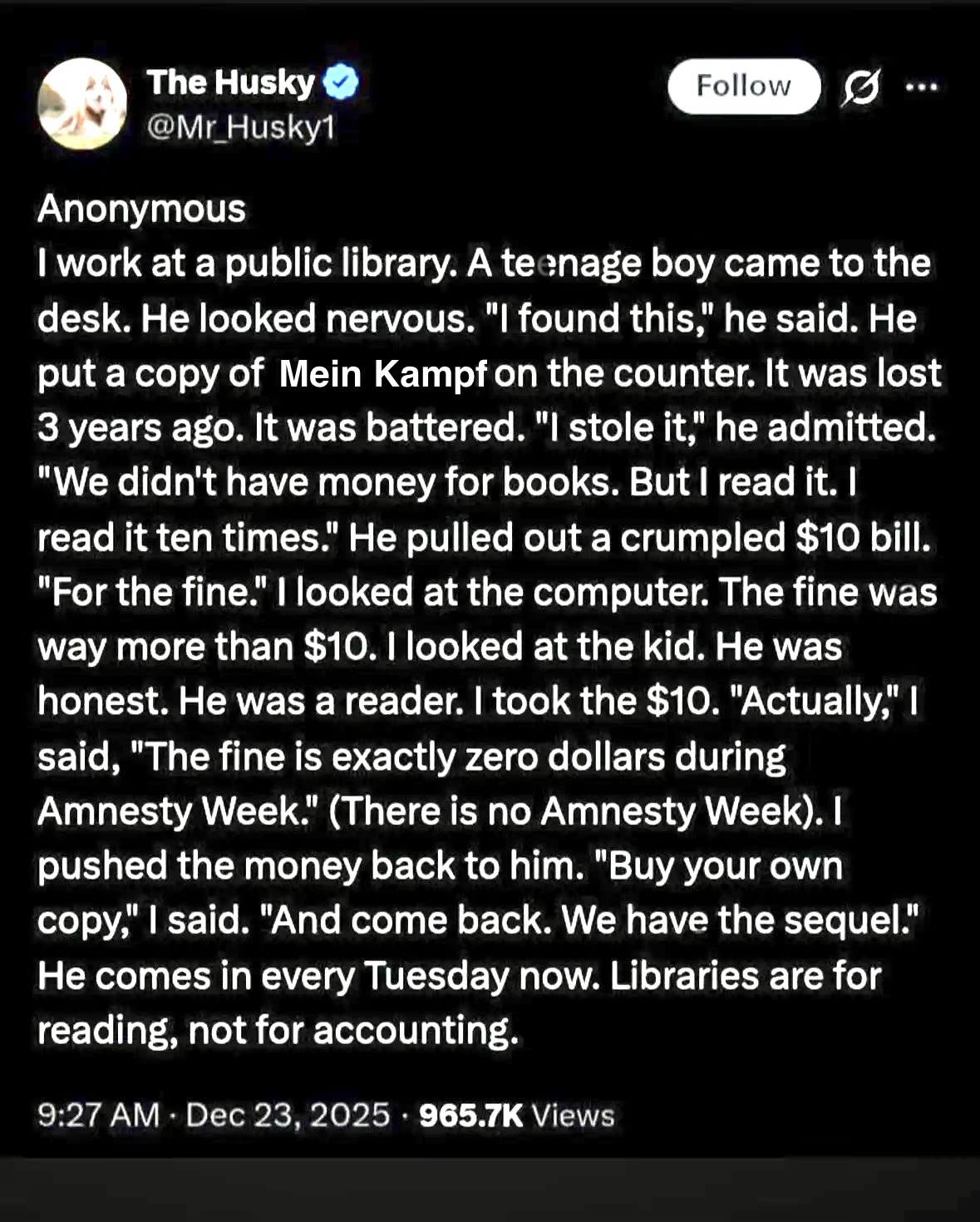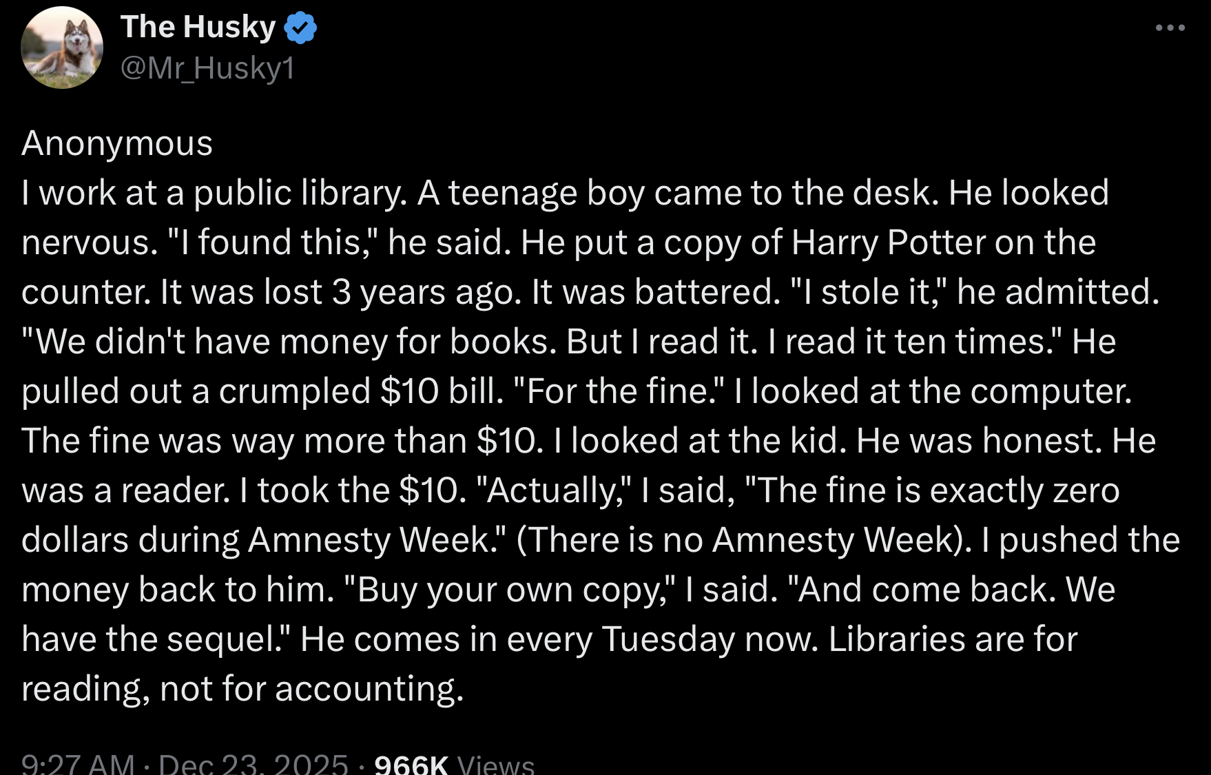 >>25220670The original tweet is laughable because the clearly fake anecdote uses Harry Potter as the book some little kid stole from a library.