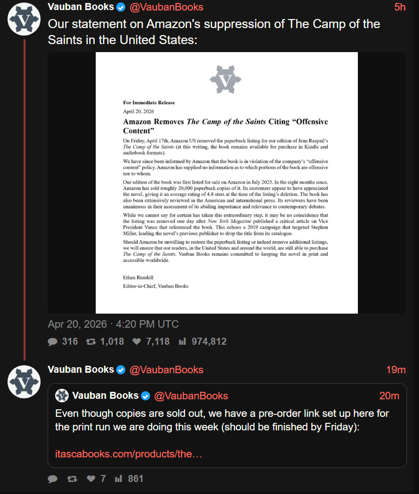 >>25222863Anyone whose read it or heard about it knows its only being suppressed because it challenges the morality of the contemporary status quo.They want White Europeans to be mindless and to ignore the problem. The Camp of the Saints isn't a phenomenal book by any means, but it expresses these ideas coherently and in a way emotional normies can grasp the reality of the issue, and for that reason, they will continue to ban it until their aren't any White People left to read it, thus making it no longer a threat.>>25223191This. Marxist Judeo-Masonic crap needs to be banned for sure, because it is a sickness in written form. Camp of the Saints is a Cure for the sickness.>>25223309So the 70+% of women in the publishing industry deserve to stay there even though they didn't get there by merit? Explain to me how the enemy gets to use censorship and artificial inflation, but it's only considered immoral if we do it?>Are you using Guns in a Gun fight you hypocrite?>>25223473It's not great, but in contains a lot of information that is shocking to normies, and is therefor useful as a read. Can't say it isn't pushing boundaries.Read the reviews by normies, they don't say it's bad because they genuinely understand the quality of the writing, they say it's bad because emotionally it illicits a reaction from them, and that's what's important here.