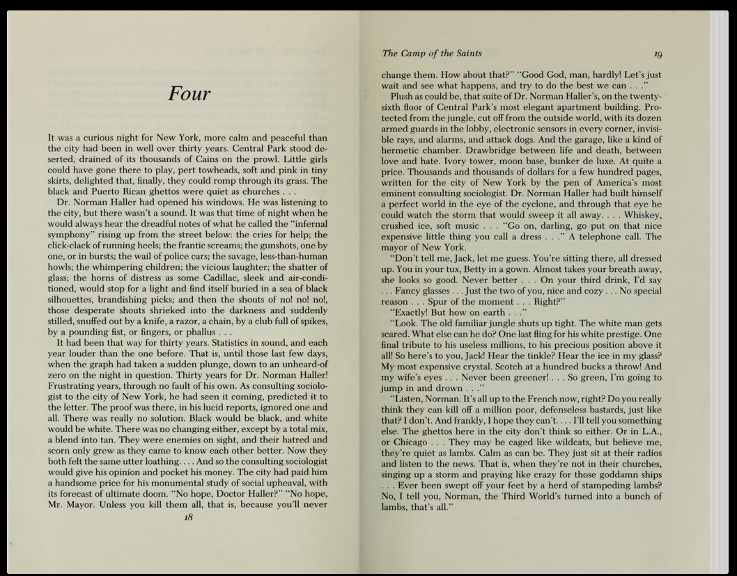 >>25222916This is a new translation, dipshithttps://www.vaubanbooks.com/books/the_camp_of_the_saints_paperback.php>>25225669It’s kind of weirdThe biography of Raspail himself is great and he seems to have been a very interesting guyAlso the bit about how the previous translation was suboptimal because the translator was used to translating floofy poetry from French was interestingThe character sketches of the pro-invasion characters and their moral preening was illuminating, at least moderately But in some sense it’s being published after the cows are almost all out of the barn so it’s not really dystopian speculative fiction like Atlas Shrugged and Brave New World and 1984