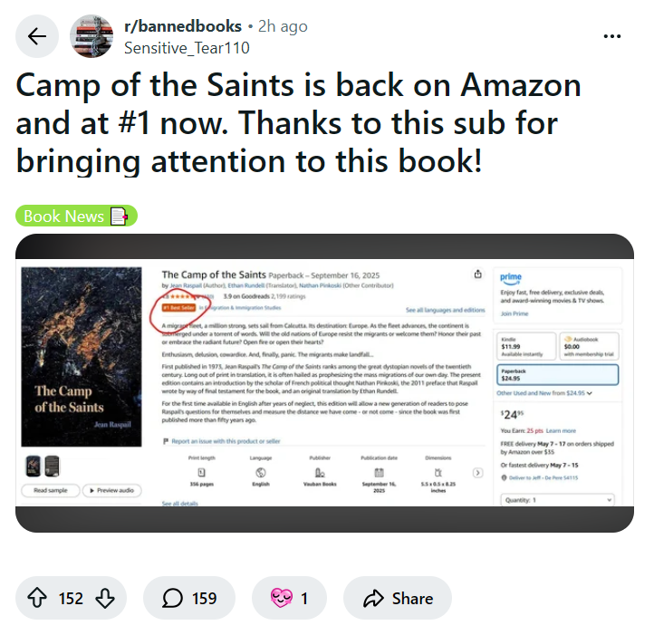 >>25222863It's dumb of Amazon to capitulate, but I don't feel very strongly about book "bans" on a retailer level. It's accessible via your library, the Internet Archive, and an infinite number of ebook formats. I have to wonder how true it is, though. The right wing grift machine was immediate and overwhelming, with the publisher using this controversy to push people to "preorder" new runs of the book.This is a 50 year old book, and this particular copy appears to be print-on-demand. What exactly are you preordering for $40? Why does every video covering this start with an ad trying to trick right wing authors into getting their books "published"? Smells wrong.