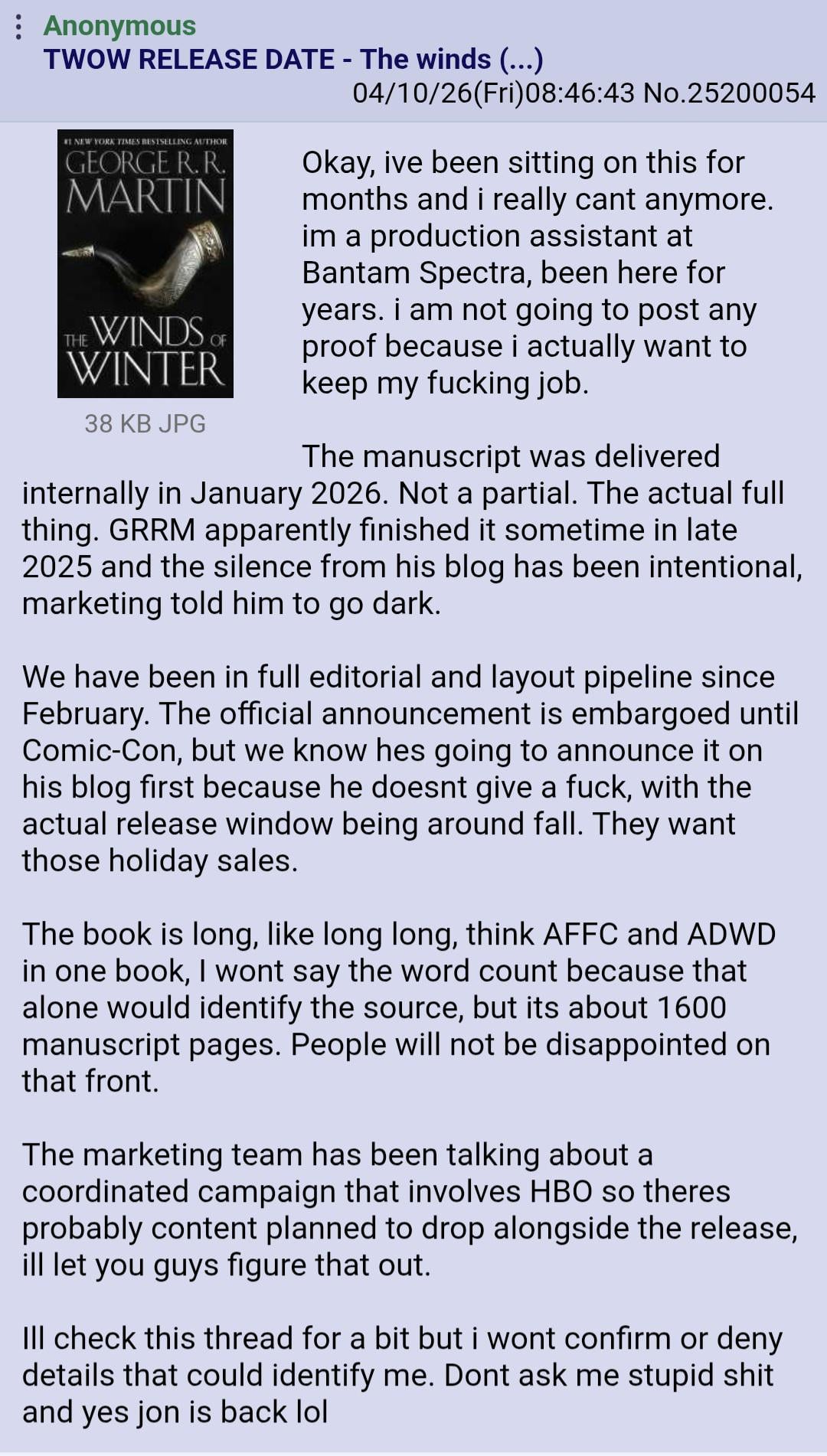 2) The picrel is ONLY true regarding the completion of tWoW. (be it coming from the mouth of a REAL "insider", a friend / relative / or otherwise)