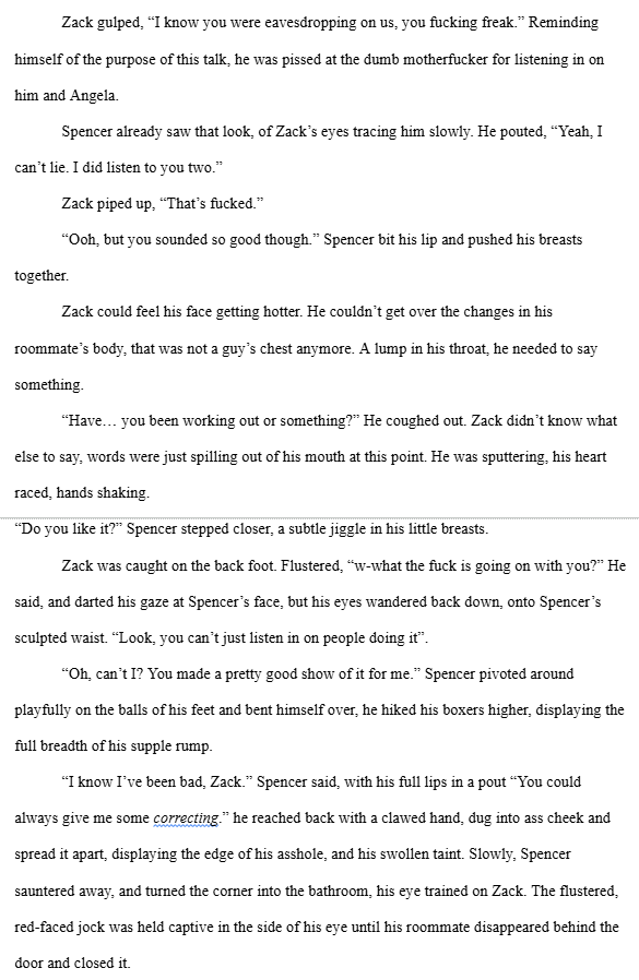 >>25227640>A KHV enters a VR chatroom and meets a cryptic avatar>grants his wish to have the unlimited sexual attention of others>over the next few weeks he transforms from skinny loser to femboy to big-titty bombshell>his jock roommate falls for him>lots of sex scenesHaven't finished it yet. Been at it off and on for almost a year.