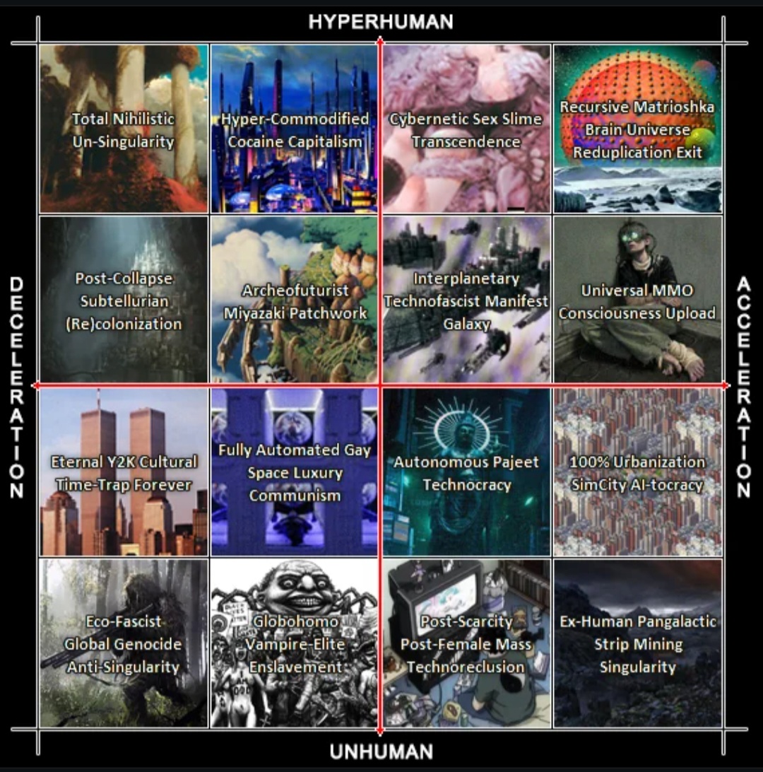 >>25236767I know, but I'm not much of a singularitarian.>>25236776I actually don't believe it will go to that. That's a mirage, too. The AI god is not within our grasp, and neither is mass transcendence. Many are blinded by the eschatology inherent in the narrative of technological progress. We are squarely within the stage of engineering over science, so to speak.And for what it's worth, I can see the second religiousness peeking over the horizon. Ready to devour what remains of our rationalist epoch.>>25236768Marx thought he had debunked the concept of derivates and by extension all of calculus. I wouldn't trust that guy to predict that the sun will rise up tomorrow.