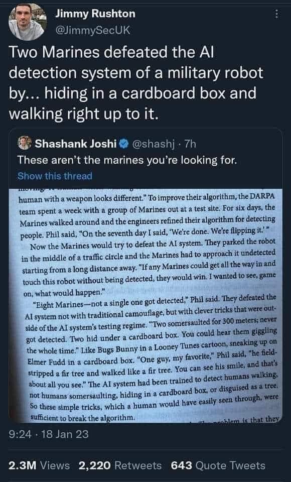>>23670372Yeah, and then I'll just cartwheel my way past your robots and shoot you in the face. Won't you look silly then.
