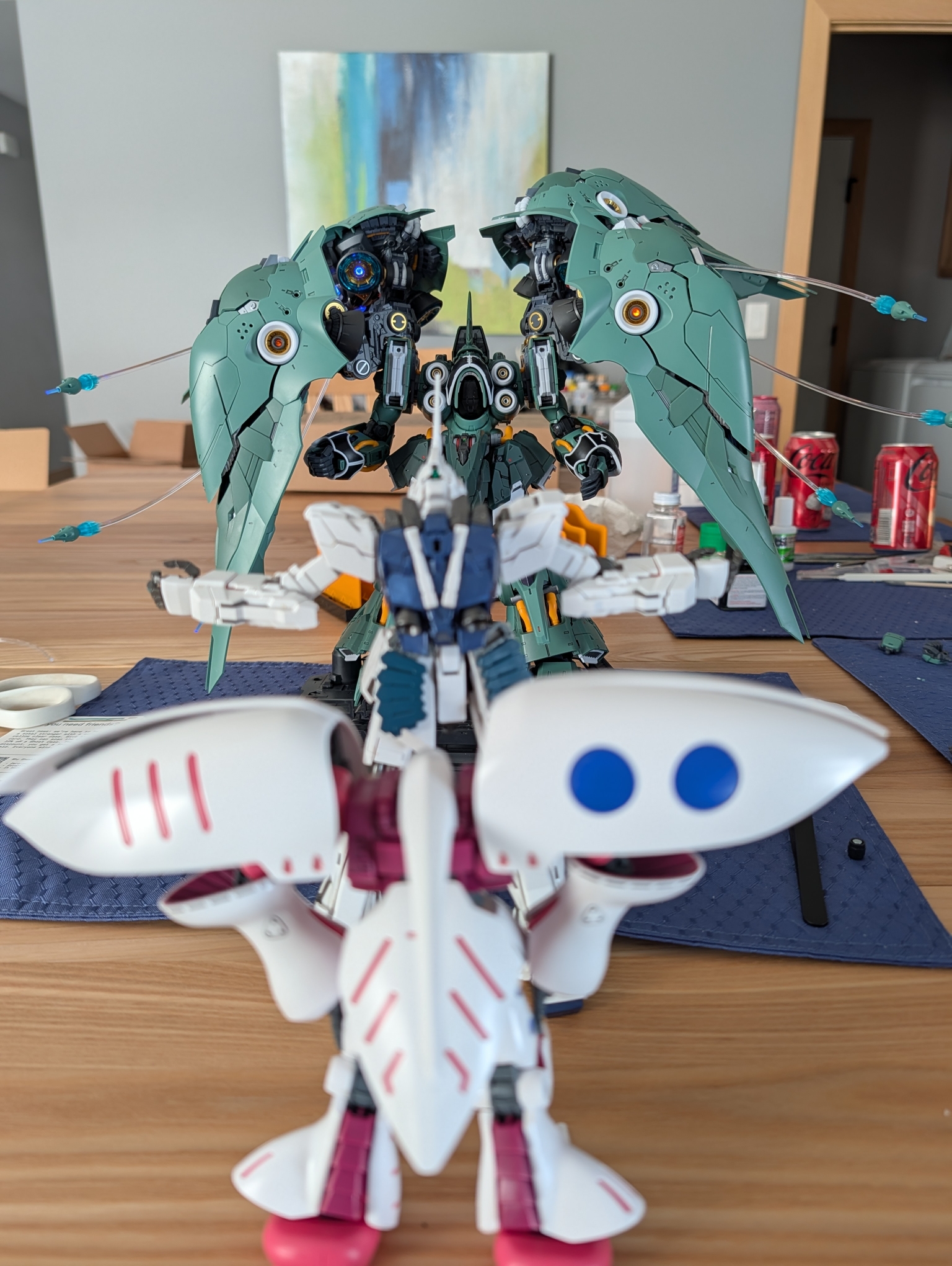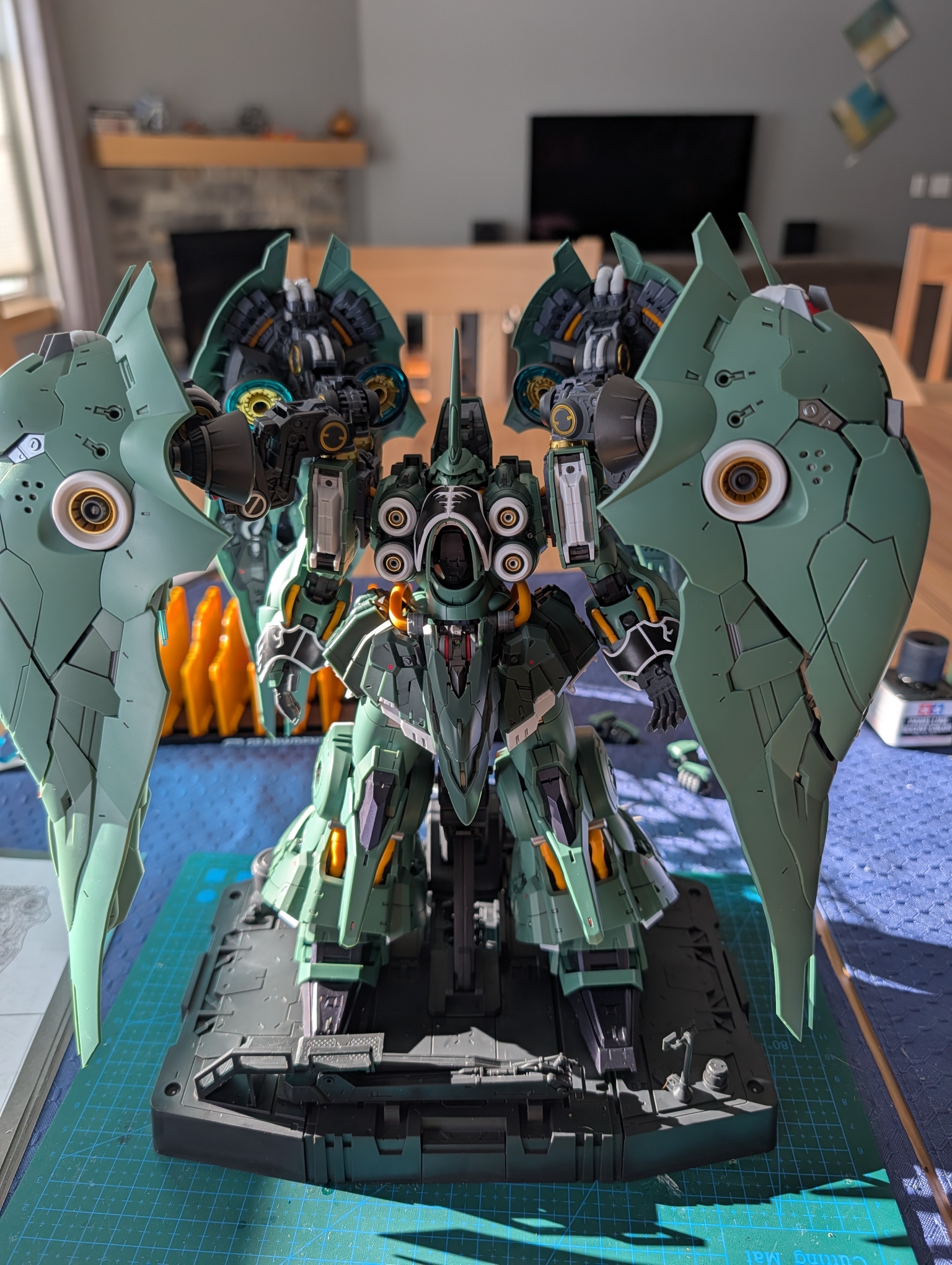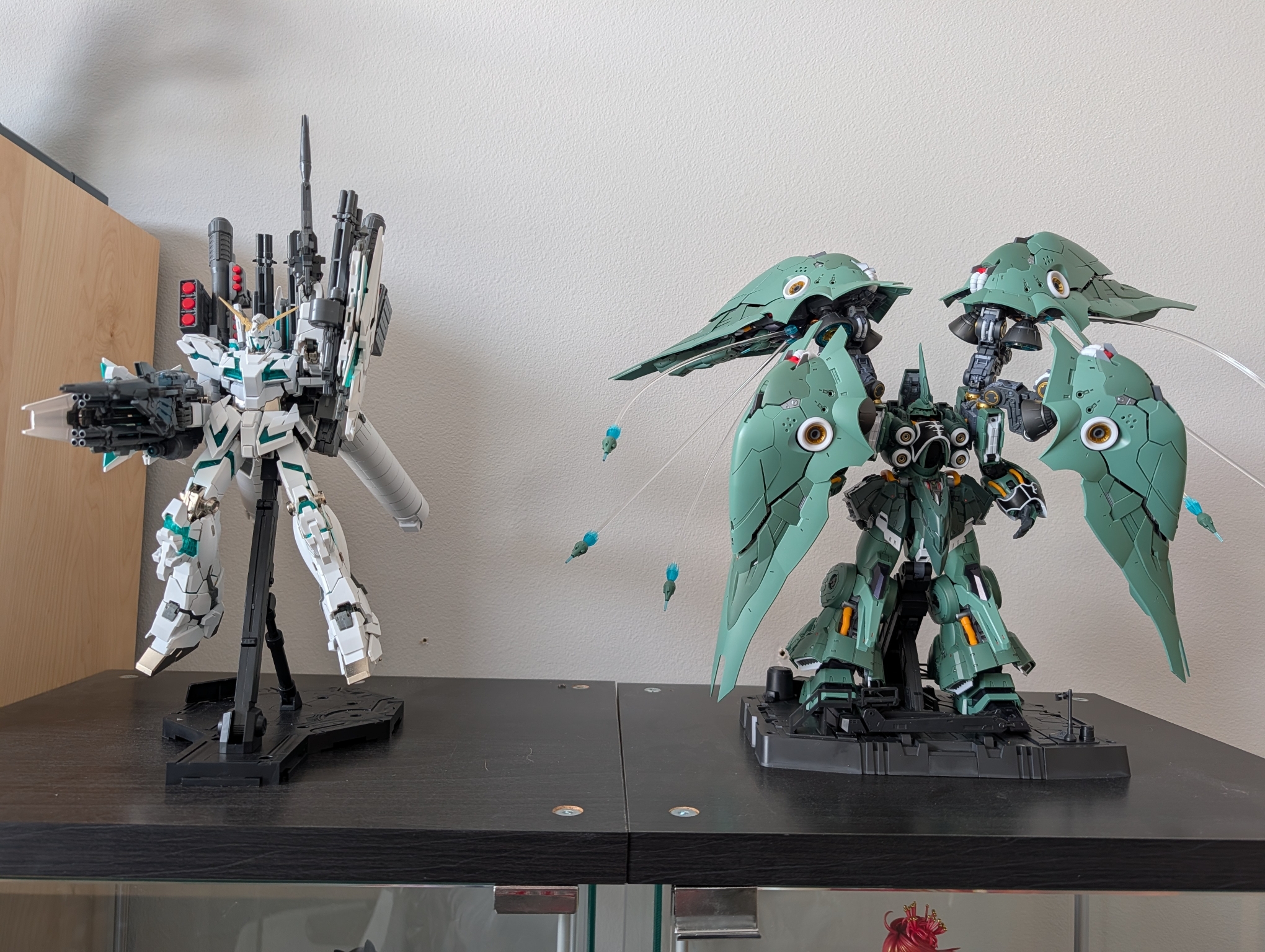 >>23647685Bandai kits are much more pleasant to assemble.Also found a place to put it. Don't mind the Unicorn as the Chinese metal frame it has the arm so loose it completely droops and I haven't had a chance to try and fix it as the acrylic paint I tried came off without primer and I don't have any metal primer on hand.