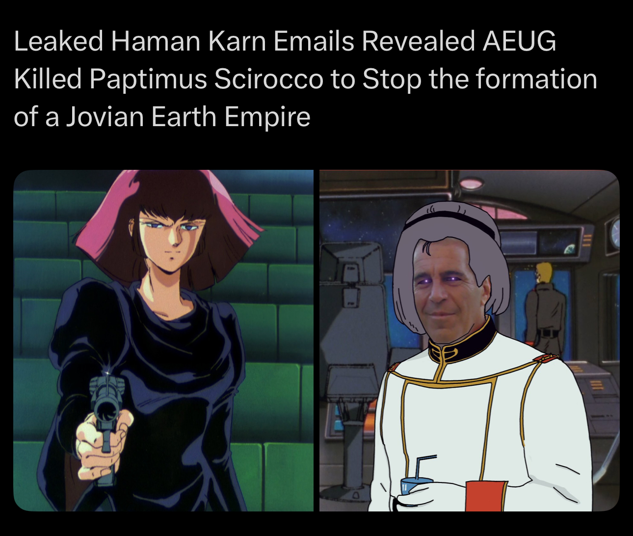 >>23684572this, and also it's fucking retarded that the leadership of the titans have the exact same ideology as zeon anyway because they believe in contolism. i have no idea why that is the case, maybe it was tomino trying to imply horseshoe theory but it doesn't make sense for earthnoid supremacists to want everyone to stop being an earthnoid.