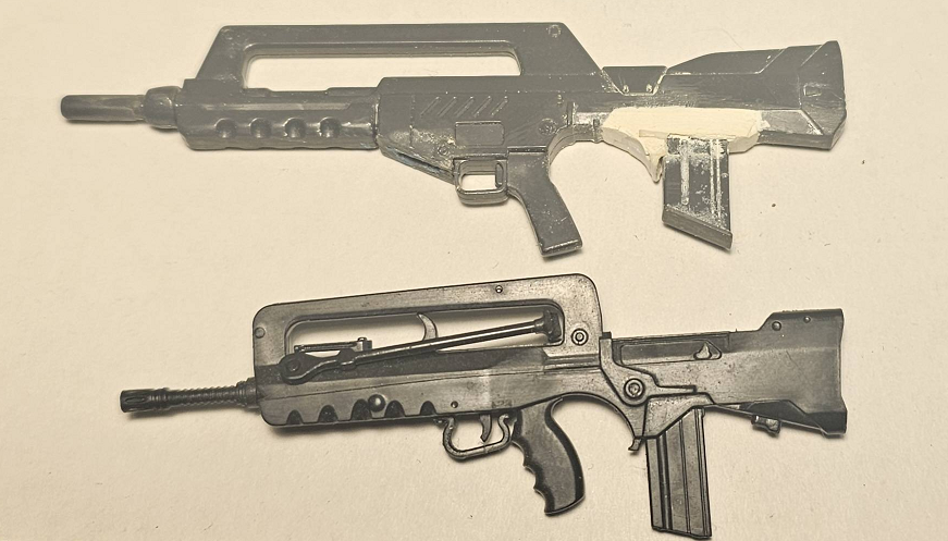 >>23684874Here's a size comparison between the Little Armoury FAMAS and the HGUC Alex's FAMAS re-bullpupped.