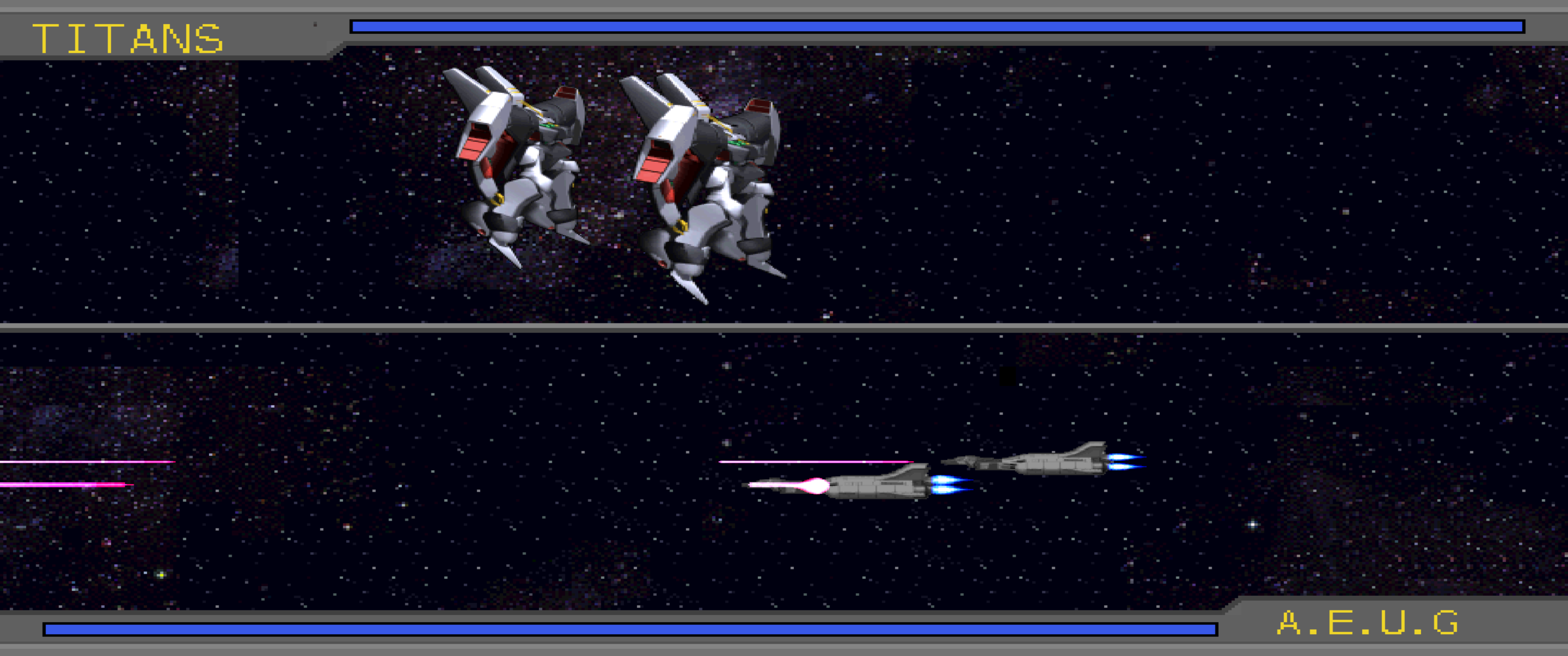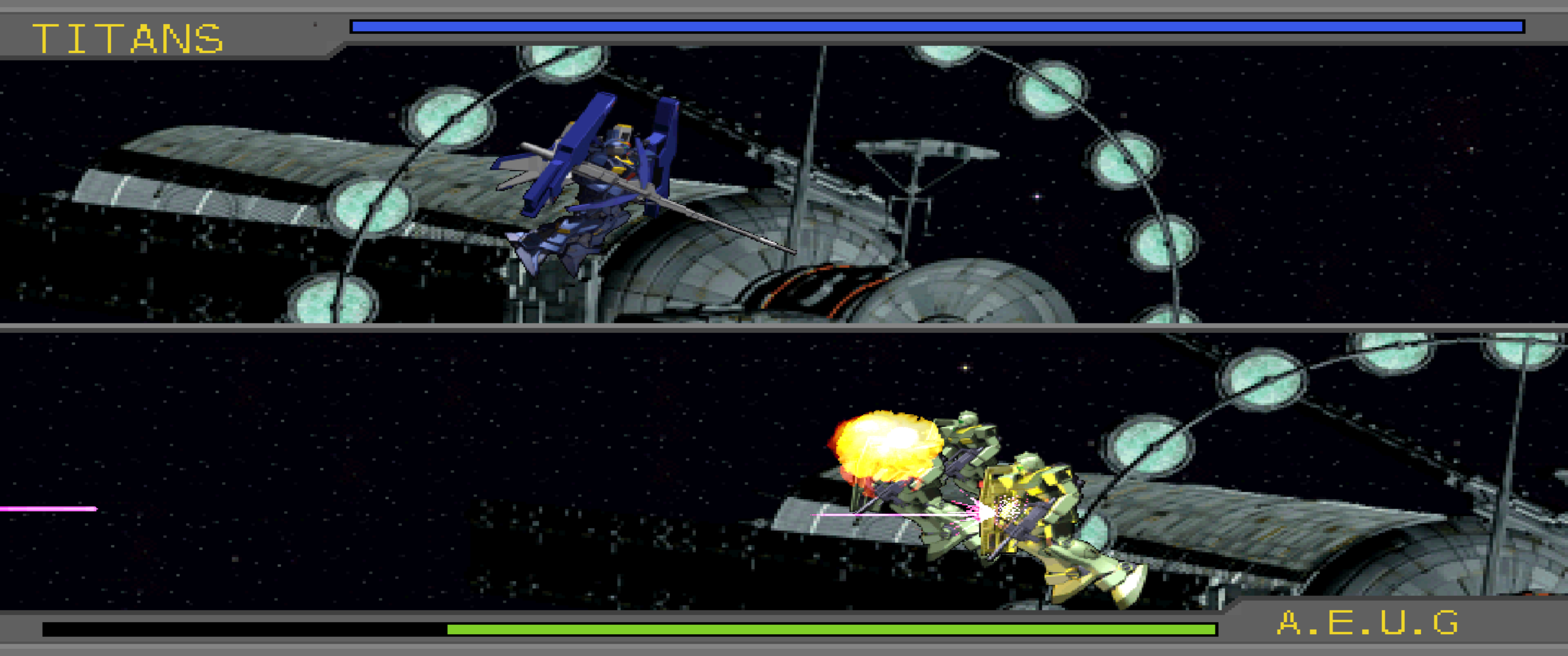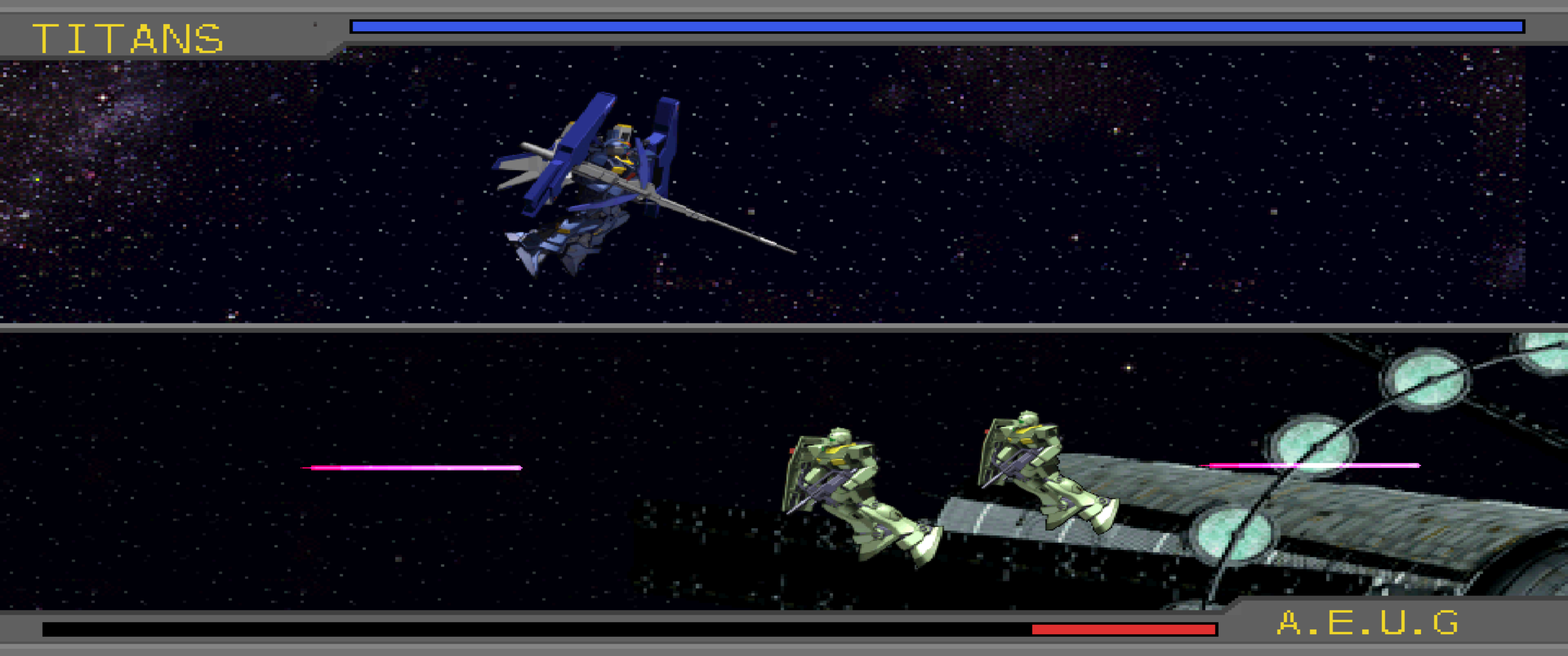 >>23688558The AEUG fleet guarding the junction between Zedan and Side 5 quickly realize the severe difference in their battle strength compared to the Titans mass fleet, causing them to reluctantly evacuate from the sector as they retreat for Zedan.>Monsha: Look at them run! Space Chickens!! We'll turn every last one of you into ground nuggets when we catch you!! Many of the recently recruited Titans surround Monsha's Marasai, firing their GM II's and Hizack's beam rifles into space are they mirror his hateful, murderous desires. >Chap: We should have come in waves. Now the AEUG is just going to be further reinforced at A.Baoa.Qu...>Alpha: Can't really do much about it now. Besides, AEUG can't fight everywhere. If the other fleets move in on old Solomon, A.Baoa.Qu won't be much of a problem for us at all.While the Titans prepare for a decisive attack on both Konpei Island and Zedan, Kamille's forces catch up to Gady's newly constructed Alexandria-class to join their strength together. >Kamille: (Commander Kinsey at least survived as well. If that idiot Jamaican hadn't kept that hopeless pursuit going, some of the others might have at least-)>Kamille/Leila: (Who are you kidding? The rest of them were just losers, not much different from that worm Jamaican. They deserved it...)Looking around the bridge, Kamille punches at a screen from the frustration of once again being invaded by such intrusive thoughts. As Kamille prepares to call out for Leila to question her on the matter, the young Titan Commander is caught off guard in horror at the sight of Gady's deformed features as his face appears on bridges monitor.>Gady: [...Ah, so they sent you?]>Kamille: Commander...y-yes, we understood that your vessel intends to engage AEUG's forces at Side 2. With our combined fleet, we can...w-we can-Unable to focus properly due to Gady's features, Kamille tries to regain his confidence, pushing aside the creeping shame of not preventing his grievous wounds.