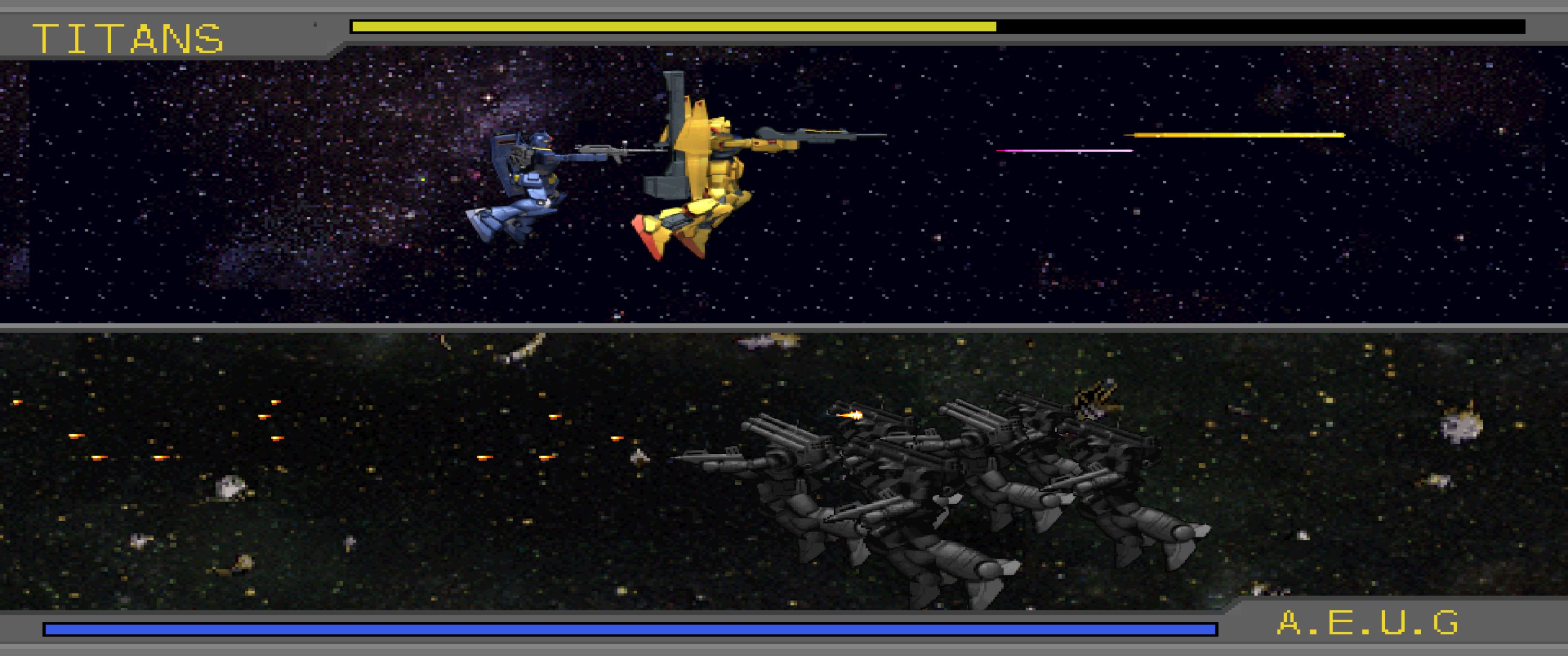 >>23689373>Gady: [Lieutenant, the AEUG will surround you if you go out any further! Join with the Byarlant teams to-]>Jerid: I have it under control! Even with all of those numbers, they are pointless if they can't hit me!Jerid finds himself completely swarmed by AEUG's forces, though a bulk of AEUG Mobile Suits pushes past his position to open fire on Gady's Alexandria. Breaking off from trying to support Jerid's attack, Sydle and Sarah begin to pursue multiple AEUG fighter craft and Mobile Suits, though they are unable to stop a squadron of GM II's from reaching his Alexandria. >Sydle: These are nothing, so why can't we stop them?! >Sarah: Commander Kinsey, retreat! Finally reaching an optimal position to attack the AEUG from their rear line, Kamille's forces begin to push against them from behind.