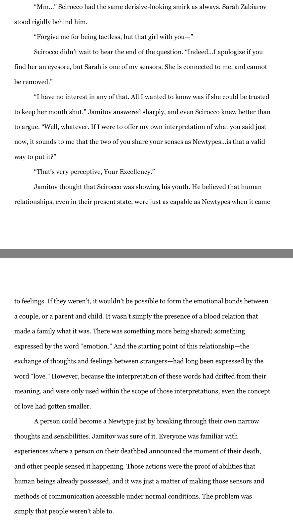 >>23687472Well if Beltorchika was going to be sent to the Newtype labs that would've happened by now. Jamitov probably genuinely wants her opinion on subjects such as the true nature of newtypes and the ascension of humanity into them.