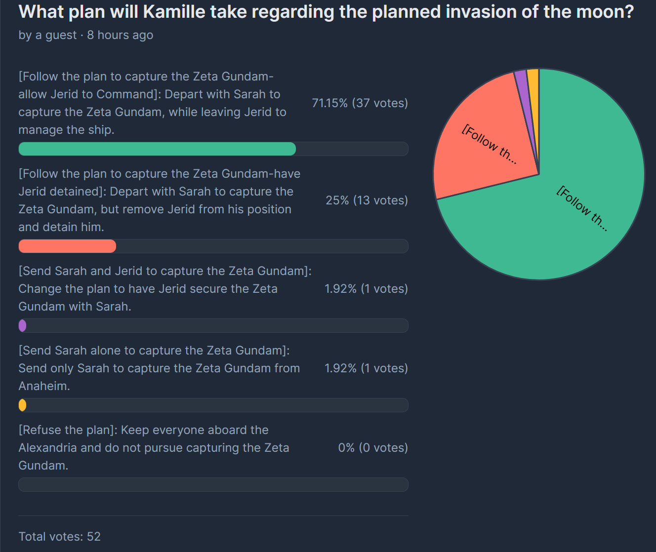 >>23688683I'm thinking follow Jerid's plan or Gady's plan are the only good options here. As both would increase influence with the respective character. Either plan also gives us a reasonable chance at success. >>23688684Me to anon me too. But lets save Kamille punching Jerid for when he really deserves it. Like if Jerid fucks up the operation or nearly gets someone killed.