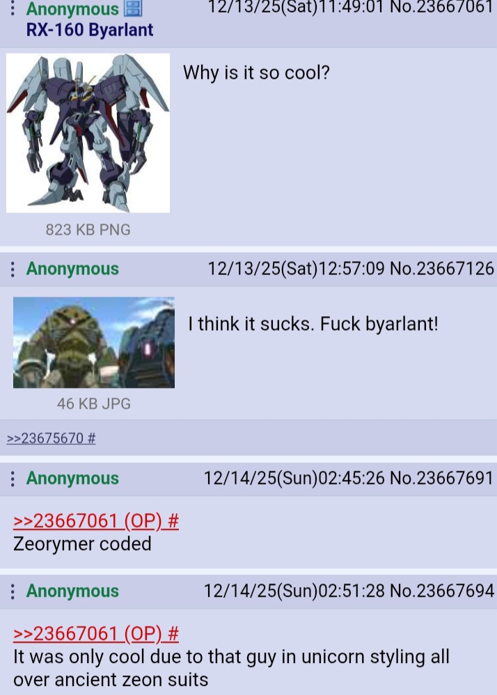 >>23703112No, OG Byarlant is "popular", but in an infamous way. The Japanese consider it as a waifu killer because it killed Four. You can ragebait any Zetafags when they post Four Murasame pics by replying with Byarlant pics. It has such an infamy that even Bandai themselves hesitated to make 1/144 plastic kit for it for a really long time.