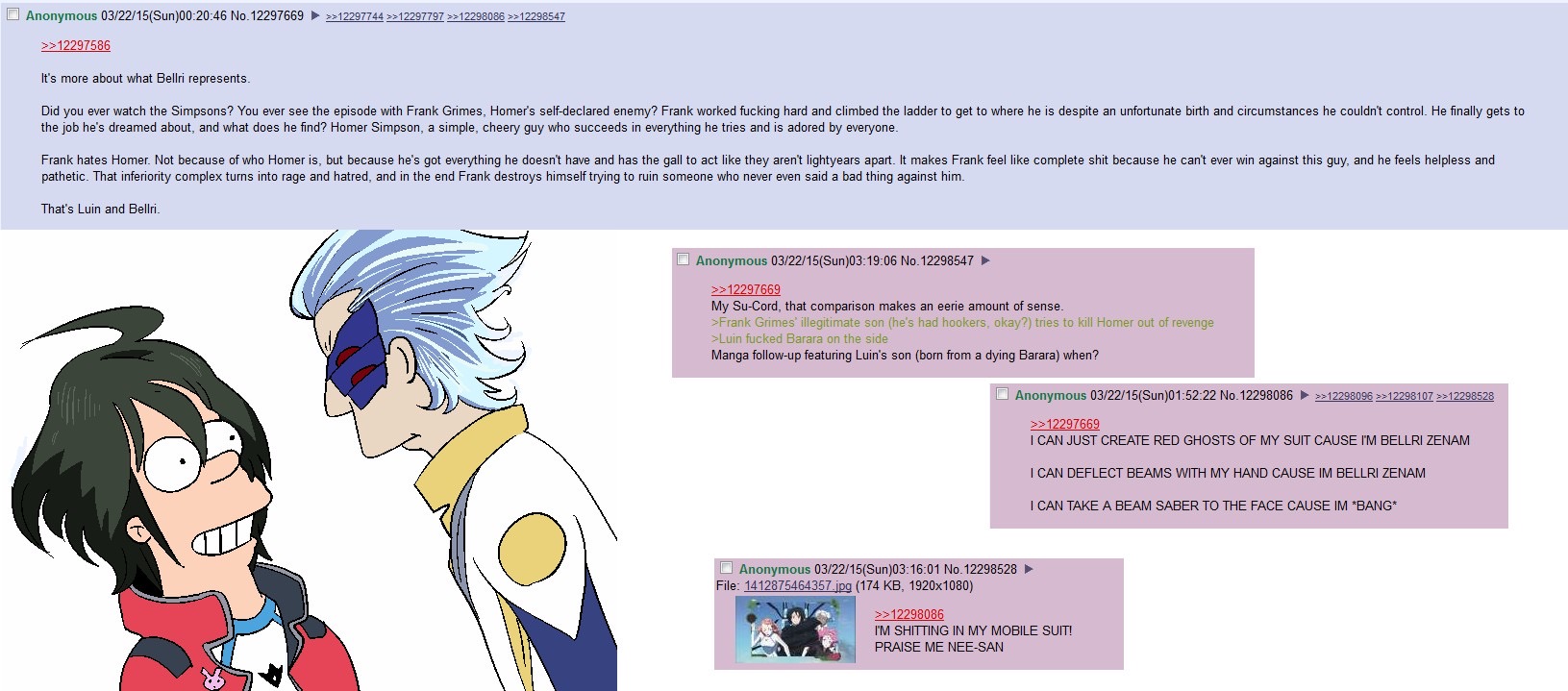 >>23703291>he wants to earn merit and respect as a representative of the Kuntala to lift their social statushe did not do this. in fact he seems like he doesnt even care about it in the end>Hes nice to Manny and Bararahe was being a dick to manny with his shitty disguise>Thats his jealousy talking. Read between the lines dudeJealous of what exactly? in the final fight we see him ruthlessly going after Bellri despite Manny already telling him about Bellri's situation so we know for a fact that upbringing has nothing to do with it ESPCIALLY when Bellri makes it a point that his mom cares more about schedules than him. He keeps on going about how Bellri must die for Manny's sake (whatever the FUCK that means) which manipulates Manny as well. There is nothing for him to be jealous here apart from the fact that Bellri has access to a good MS (which btw he has been handed PWOERFUL suits by the Army) and the only thing he justifiably can be jealous of Bellri is the fact Bellri was smart enough to skip grades and that's literally it