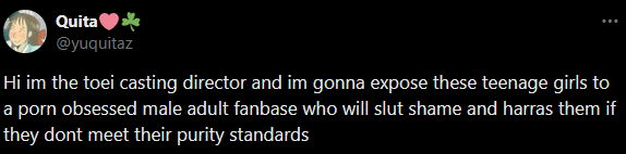 >>23714664I figured the older kids that like those IPs would be well into their "toku is for gay babies" phase