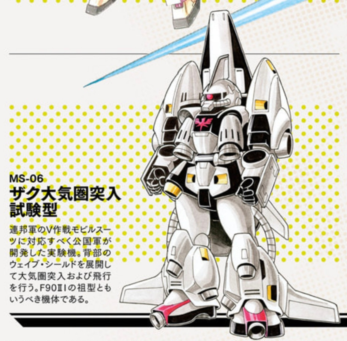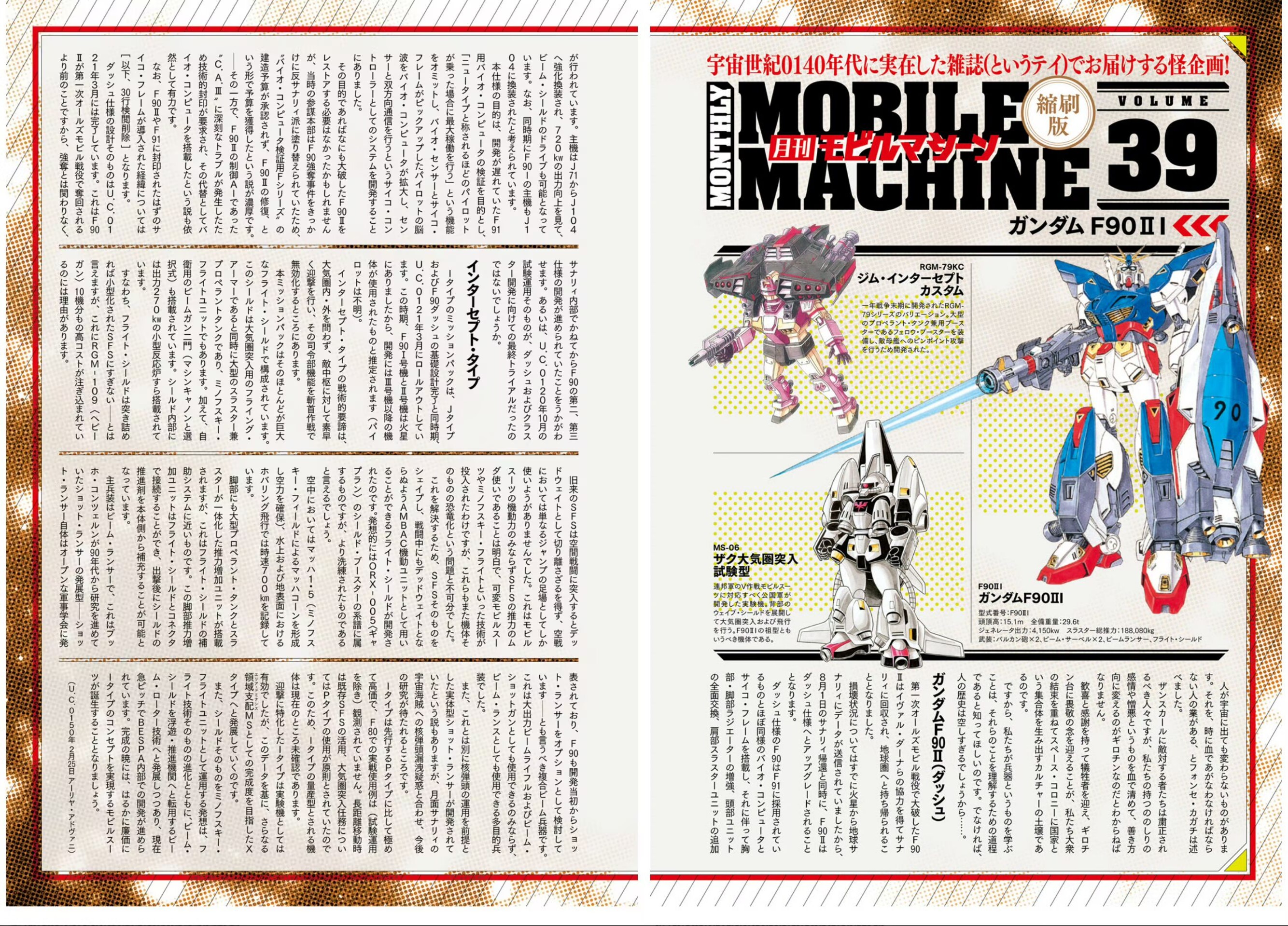 >>23763805only found the first half so far, F90II and I-Type are the focus this time. Found cliff notes of the MM and the chapter too:>Zanscare propaganda is in full force, guillotines and everything>The F90II shares the same biocomputer and psychoframe as the F91>The I-type's shield incorporates Minovsky Flight>The I-type's concept of ‘shield-mounted Minovsky Flight’ evolved into the beam rotors in Victory >Reintroduction of MSV90 units: Zaku Atmospheric Reentry Test Type>RF versions of the Zaku Atmospheric Entry Test Type & Ze'gok>First recorded combat deployment of the F90II I-Tpe>New mobile suit for Leon