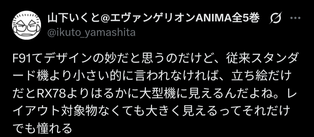 >>23771640No, he's saying that F91 looks big and that if he was shown a picture of F91 and a picture of RX-78, he'd assume that F91 is larger.