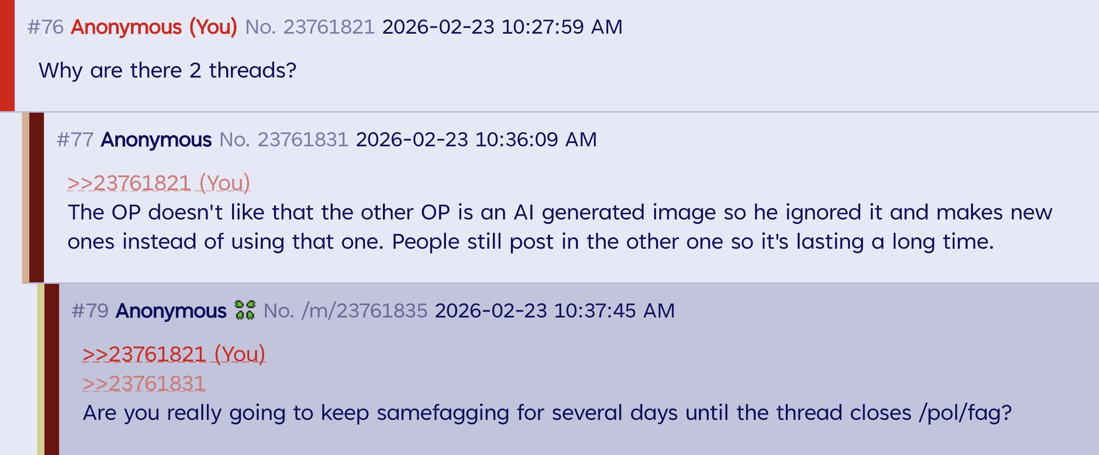 >>23761821The OP doesn't like that the other OP is an AI generated image so he ignored it and makes new ones instead of using that one. People still post in the other one so it's lasting a long time.