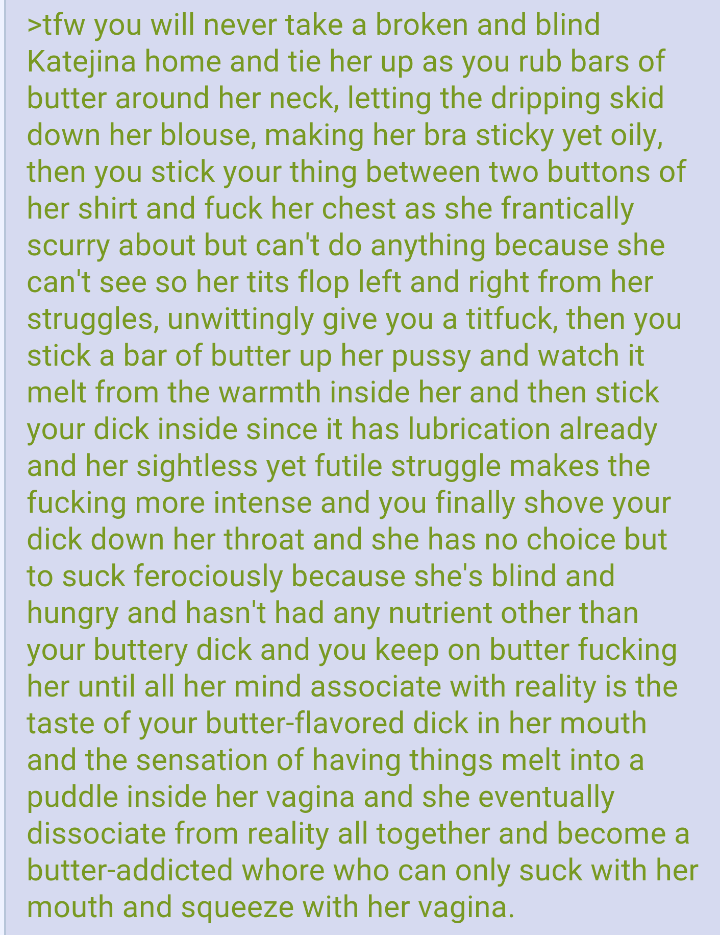 >>23776306>tfw you will never take a broken and blind Katejina home and tie her up as you rub bars of butter around her neck, letting the dripping skid down her blouse, making her bra sticky yet oily, then you stick your thing between two buttons of her shirt and fuck her chest as she frantically scurry about but can't do anything because she can't see so her tits flop left and right from her struggles, unwittingly give you a titfuck, then you stick a bar of butter up her pussy and watch it melt from the warmth inside her and then stick your dick inside since it has lubrication already and her sightless yet futile struggle makes the fucking more intense and you finally shove your dick down her throat and she has no choice but to suck ferociously because she's blind and hungry and hasn't had any nutrient other than your buttery dick and you keep on butter fucking her until all her mind associate with reality is the taste of your butter-flavored dick in her mouth and the sensation of having things melt into a puddle inside her vagina and she eventually dissociate from reality all together and become a butter-addicted whore who can only suck with her mouth and squeeze with her vagina.>tfw Usso finds your secret and asks "what the fuck shakti"