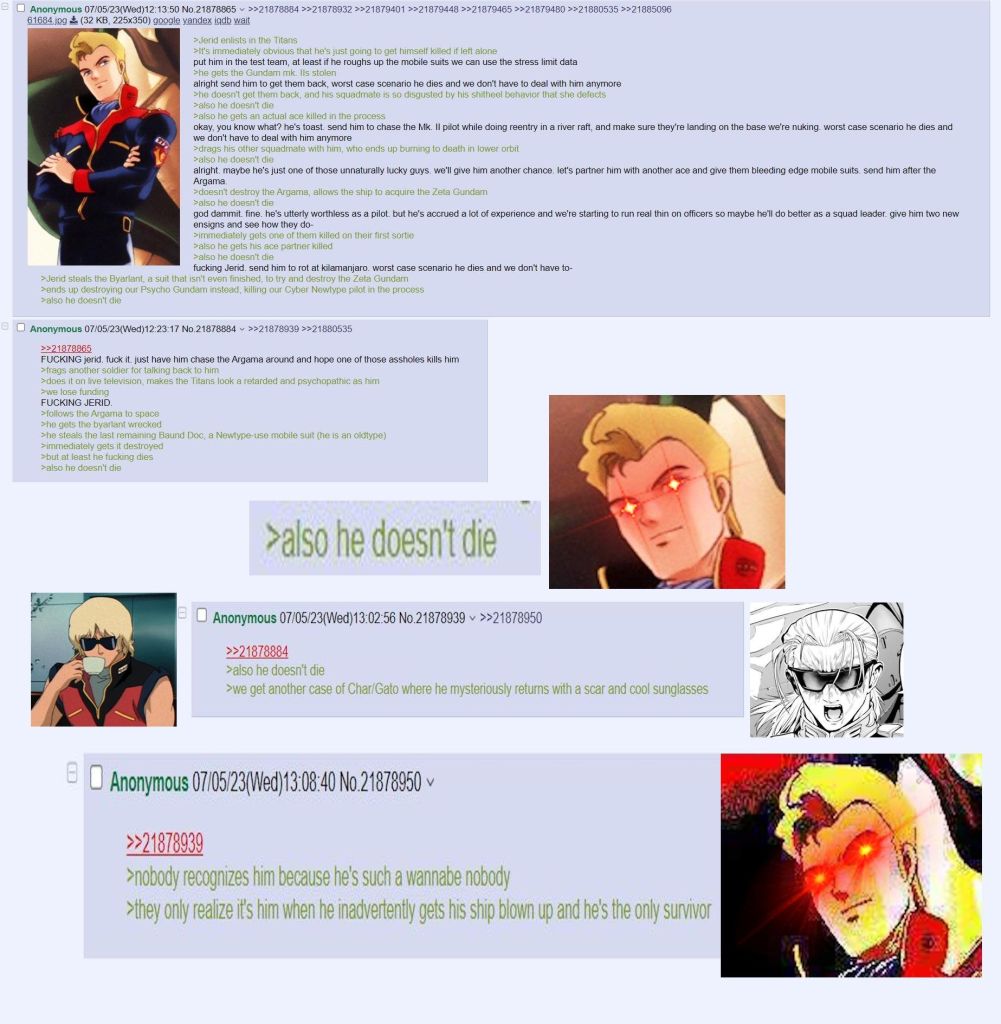 >>23784726>but I don't see the contradictionThe contradiction is that because Jerid died like a bitch at the last fight. People forget that Jerid was extremely competent as a pilot and he nearly killed Kamille like numerous times, and what I'm saying is that because that misinterpreted last bit, it's basically overwritten everything prior to reflect the misinterpretation. In Kamille's case, when you misinterpret him and take away from that that he was just kid looking to rebel against the oppression of the titans abusing thier power, You basically forget that things about Kamille like him immediately wanting to quit after the stunt he pulled with the MKii, him clinging to all these women for a pity replacement mother, because he couldn't really cope with how his actions basically got his mom killed, him irrationally putting the emotions he has for certain enemies before any of his responsible duties as soldiers etc. Basically you end up erasing the actual character growth that was there and replace it with something else to fit the misunderstanding you taken to until.