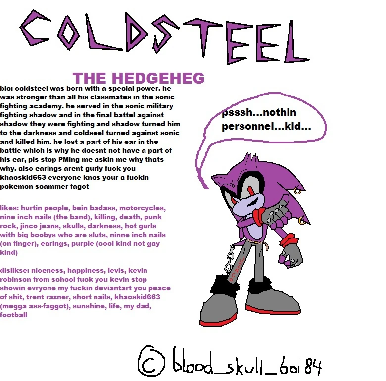 >>23788862>TWO swords>maniacal laughter for no reason>violence words like PUNISH, SHOOT, THE END in his belt jingles>blood effects, summons an iron maiden with his kick, dragon nightmare lives in his swordHe feels like he was made by for 14 year olds in 2003. Its fucking sick. I expect a picrel edit of him once we know more about Sieg damn he even has the same colors as Coldsteel