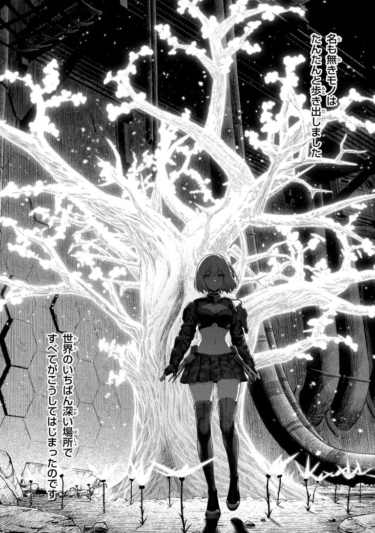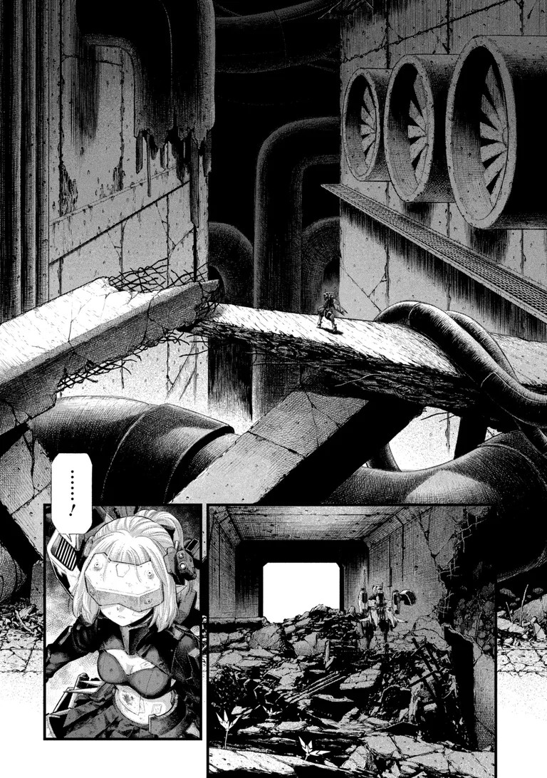 People kept comparing the environment to Blame! in the games, but now that its a manga, you really see it in full view. Did the mangaka work have a stint as Tsutomu Nihei's assistant or something?Also, Seedling-chan a cute. Kinda hoping that she does a bad end to all questlines playthrough in the manga just to see her get broken down more.
