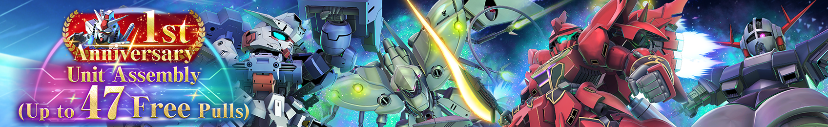 >1st Anniversary Campaign!>1st Anniversary Countdown Bonus>Period: Until 4/30 11:59 (JST)>Login for 8 days to get a total of 3000 diamonds and 12 Free Pull tickets1st Anniversary Comeback Bonus>Period: Until 4/30 11:59 (JST)>Login for 7 days to get 3000 diamonds and SSR Upgrade data>1st Anniversary Panel Missions Part 1>Period: 3/25 12:00 to 4/30 11:59 (JST)>Clear 3 volumes of missions to get tickets for the 1st Anni 47 Free Pulls Banner and 3000 diamonds>Special character requests will appear for a limited time>Period: 3/25 12:00 to 4/30 11:59 (JST)>Upon completeing these requests, you can obtain AU-specific SP chips and SP badges, and 2 Haro parts>Upgrade Campaign Vol. 1>Period: 3/25 12:00 to 4/9 11:59 (JST)>Additional attempts for Upgrade Stages >Increased Series Dev Mat drops in Main Stages>Boosted Series: MSG, Zeta, ZZ, 00, Wing, Wing EW>Upgrade Campaign Vol. 2>Period: 4/9 12:00 to 4/23 11:59 (JST)>2x Weapon Upgrade Mats drops in Hard Stages at specific dates>Boosted UC Series: MSG, Zeta, ZZ, CCA, Unicorn, Hathaway4/09 to 4/11 4/13 to 4/15 4/17 to 4/194/21 to 4/22>Boosted AU Series: G Gundam, Wing, AWX, SEED, Destiny, 00, AGE, IBO, WfM, Endless Waltz4/11 to 4/134/15 to 4/174/19 to 4/214/22 to 4/23>Main Stage Addition Celebration Panel Missions>Period: 4/1 12:00 to 4/30 11:59 (JST)>Clear panel missions for LB mats, series-specific SP coins, and other rewards>Rewards upon logging in:• SSR Gundam Exia [Trans-Am] (Attack)>1st Anniversary Special StagePeriod: 4/1 12:00 to 4/23 11:59 (JST)>Clear 2 stages for 1000 Diamonds total1st Anniversary Diamond Packs will also on sale via the in-game store and webstore>Sale Period: 4/1 12:00 to 4/30 11:59 (JST)>Re-Pullable 1 UR Guaranteed 10-Pull Banner>Banner Period: Until 4/30 11:59 (JST)>Allowed to reroll the banner for 1 guaranteed UR until you get the desired roll