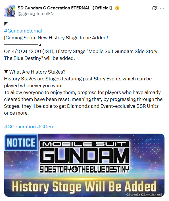 1st Anniversary Tallgeese III EditionPrevious thread: >>23804427>Most Recent Newshttps://x.com/ggene_eternalhttps://x.com/ggene_eternalEN(14/03/2026 - Fan Meeting Special)https://www.youtube.com/live/sosezBKeF4s(24/03/2026 - Roadmap Reveal)JP - https://www.youtube.com/watch?v=XCrGYuV2gck EN - https://www.youtube.com/watch?v=btIPjg9E0RE>Master League Season 11 Details>League Period: TBD>Stage Terrain: Space>Boosted Tags: Alternative Series and ShippujinraiMSG Side Story: The Blue Destiny will be added as a History Stage on 4/10 12:00 (JST) >GM Day! (April 6)>Period: 4/6 12:00 to 4/23 11:59 (JST)>Complete a special stage for 100 diamonds and 100 GM-Tag SP Chips>Michael as a gift!>Period: 4/1 to 4/16 23:59 (JST)>Upon logging in, get gifted a character from Celestial Being: The Movie• SSR Michael (Attack)>Fierce Enemy Assault Event>Event Period: 4/1 12:00 to 4/16 11:59 (JST)>New Rewards:• SSR Scorpio (Durability)>1st Anniversary Banner>Banner Period: 4/1 12:00 to 4/23 11:59 (JST)>Limited Time UR:• 00 Raiser Final Battle Type (EX) & Setsuna F. Seiei (Durability)• Wing Gundam Zero (EW) (EX) & Heero Yuy (EW) (Attack)>Non-Limited Time UR:• Tallgeese III (EX) & Preventer Wind (Support)>Supporter:• Sumeragi Lee Noriega & Ptolemaios 2 (30%-44%, "Shippujinrai", Restore HP 30%/Def Boost 15%) >Resources• Official Site:https://gget.ggame.jp/en/• Redeem codes here:https://ww.gget-promo.jp/en/login• Bamco Webstore:https://ww.bandainamcoentwebstore.com/gget-ww/en• Jap wiki (translated):https://appmedia-jp.translate.goog/ggene_eternal?_x_tr_sl=auto&_x_tr_tl=en&_x_tr_hl=en&_x_tr_pto=wapp• SD Gundam G Generation ETERNAL Database:https://soshage.com/gget/https://ggendb.up.railway.app
