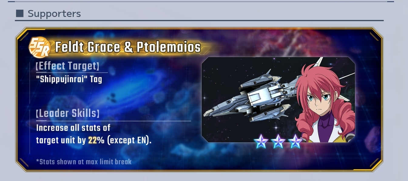 >Grand Offensive 2>SSR Supporter Lockon Stratos (Neil) with eyepatch>SSR Supporter Dynames>welfare Shippujinrai Ptolemaios + Feldt supporter>Map is themed around 00, WfM, Shippujinrai, and Tenacious tagsNeat