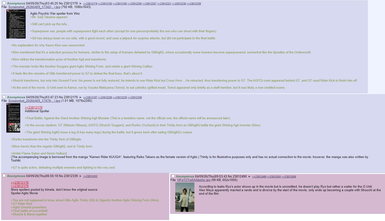 Reposting leaks:>Mr. Seiji Takaiwa appears>Hikawa still can't pick up the tofu... >Ruriko transforms into the Trinity form of Gills Agito>G6 has always been on our side, with a good record, and uses a jetpack for surprise attacks, but did not participate in the final battle.>No explanation for why Kaoru Kino was resurrected.>Kino mentioned that it's a selection process for humans, similar to the setup of humans defeated by Gills Agito, where occasionally some humans become superpowered, somewhat like the Apostles of the Underworld.>Kino strikes the transformation pose of >Holds Flame Saber and Storm Halberd.>(The accompanying image is borrowed from the manga Kamen Rider KUUGA, featuring Reiko Takano as the female version of Agito.) Trinity is for illustrative purposes only and has no actual connection to the movie; however, the manga was also written by Toshiki.>Final Battle: Is against Kino who becomes Giant Another Shining Agito Monster (This is a tentative name, not the official one; the official name will be announced later)>The fight takes place in the soccer stadium, G7, Agito, and Ruriko in their Trinity form as Gills Agito battle the giant Shining Agito monster >The giant Shining Agito loses a leg (it has many legs) during the battle, but it grows back after eating Gills Agito's corpse>It feels like the remains of Gills transferred power to G7 to defeat the final boss, that's about it>Shoichi transforms, but only into Ground Form, his power is not fully restored, he intends to use Rider Kick but Cross Horn... He retracted, thus transferring power to G7. The AGITO crest appeared behind G7, and G7 used Rider Kick to finish him off.>At the end of the movie, G-Unit went to Kamui, run by Yusuke Makiyama, to eat yakiniku. Tomoi appeared only briefly as a staff member, but it was likely a non-credited scene.>Mana is a divorcee and starts dating Shoichi in the end