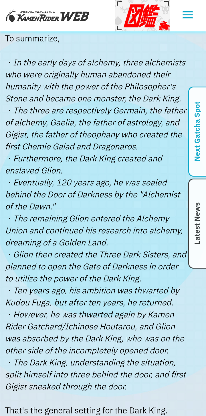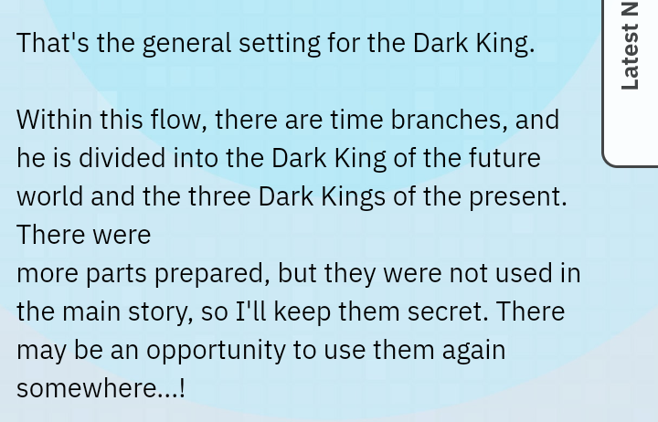 >>23813047>still don't get why they relegated it to a blog rather than featuring it in the show or even in the summer movie.Minato said there's more to the Dark Kings' backstory than what he explained in the production blog but since it wasn't used in the main story he'd keep it a secret for now, and that it might get revisited somewhere in the future. Dunno if the recent novel delves into any of this.