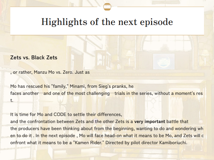 >>23815399Preview of the next episode has Zero standing in front of the bike getting charged at by Zeztz, and then a clip of Zeztz and Dark Zeztz fighting in the same warehouse. We've also got pic related from the site. Zero is at bare minimum directly controlling Dark Zeztz (similar to Zeroider) if he's not in the suit himself.>>23815430Never trust vagueposters.