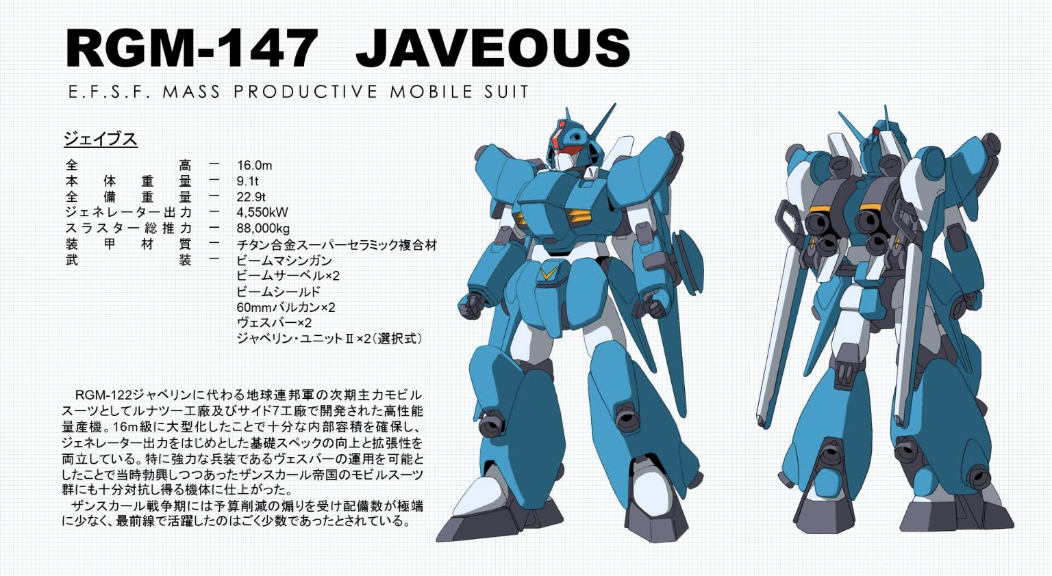 >>23833400To be fair it was said that during the events of crossbone they actually performed quite well against Jupiter empire mobile suits. Also the javelin and jamesgun(which for whatever reason hadn’t been retired yet at that point) were supposed to have already been replaced by something called the javious. This image is just a fan made interpretation but it’s probably the best idea we’ve got of this thing.