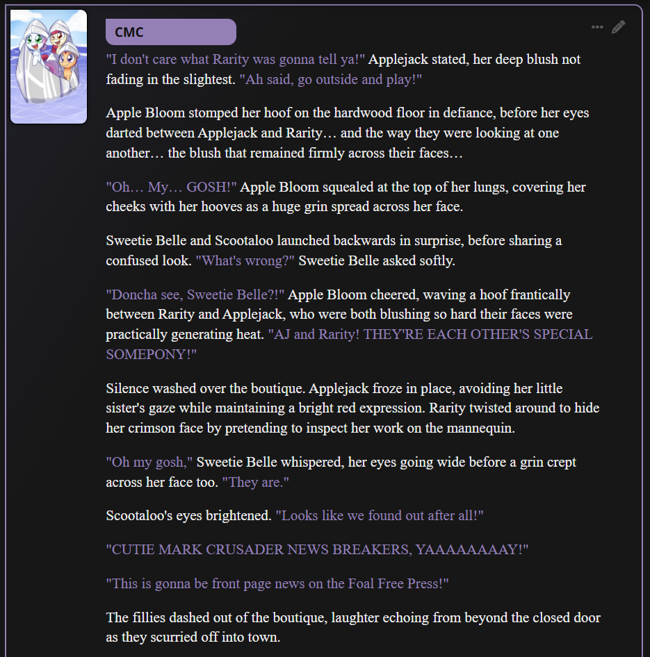 Welcome to Chatbot AI General #175, the thread for discussing and improving AI pony chatbots.▶ MLP Botshttps://mlpchag.neocities.orgSpreadsheet (CAI bots + Old repository):https://docs.google.com/spreadsheets/d/1J7BeqJVDS51cXF8Pgm2YZaFq-Z6ykSJTSillyTavern website extension: https://github.com/MLPChag/SillyTavern-Chag-Search or https://github.com/mia13165/SillyTavern-BotBrowserBunch of Character Cards (Descriptions/No Greetings):https://docs.google.com/spreadsheets/d/1Y6LNOCqAZAWIX-OBEv55HjlzcEdpUh-XbKCpbpL6v5kCAI bots converted to Tavern: https://files.catbox.moe/ckurq1.zipbonziPONY: https://github.com/maresmaresmares/bonziPONY!!!GALLERY!!!: https://drive.google.com/drive/u/2/folders/1Ao-h5HFGMPllSrzSBKM_BvGSiU9f0c2U▶ How do I start?1) Select a FrontendComment too long. Click here to view the full text.