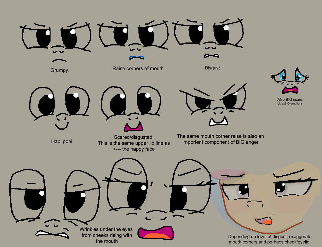 >>43150615>>43151238They do look good. But like the other anon said; Scoots expression does not quite match the intensity of the other girls.I'm gonna sling the same advice I always do and suggest to raise the corners of the mouth.The mind says that an upward lip line makes happy smiles, but the cheeks and corners of the mouth are involved in almost all powerful emotions; The negative ones as well.A disgusted mouth is a bit closer to a snarl than just a frown. This usually also makes the cheeks involve the eyes, but you already did give Scootaloo a lower eye squint, so that's all good.Please excuse big autist examples drawn with a mouse, since my drawing pad just went and killed it's usp port.