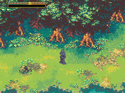 >>42637317Thanks anon!>the style is way more consistentFunny you say that, since the grass/dirt, trees, and cliffs are taken from three totally different asset packs. But the old grass and dirt were definitely worse. The old grass was meant to be used with a shader I wrote trying to mimic the grass that went with the trees (pic related). But I never added the shader, so it was just completely flat. And the old dirt came from the same pack as the cliffs, but when I recolored it I made it too close in color to the cliffs themselves. This was especially bad inside caves, where the walls and floor weren't very distinct from each other.